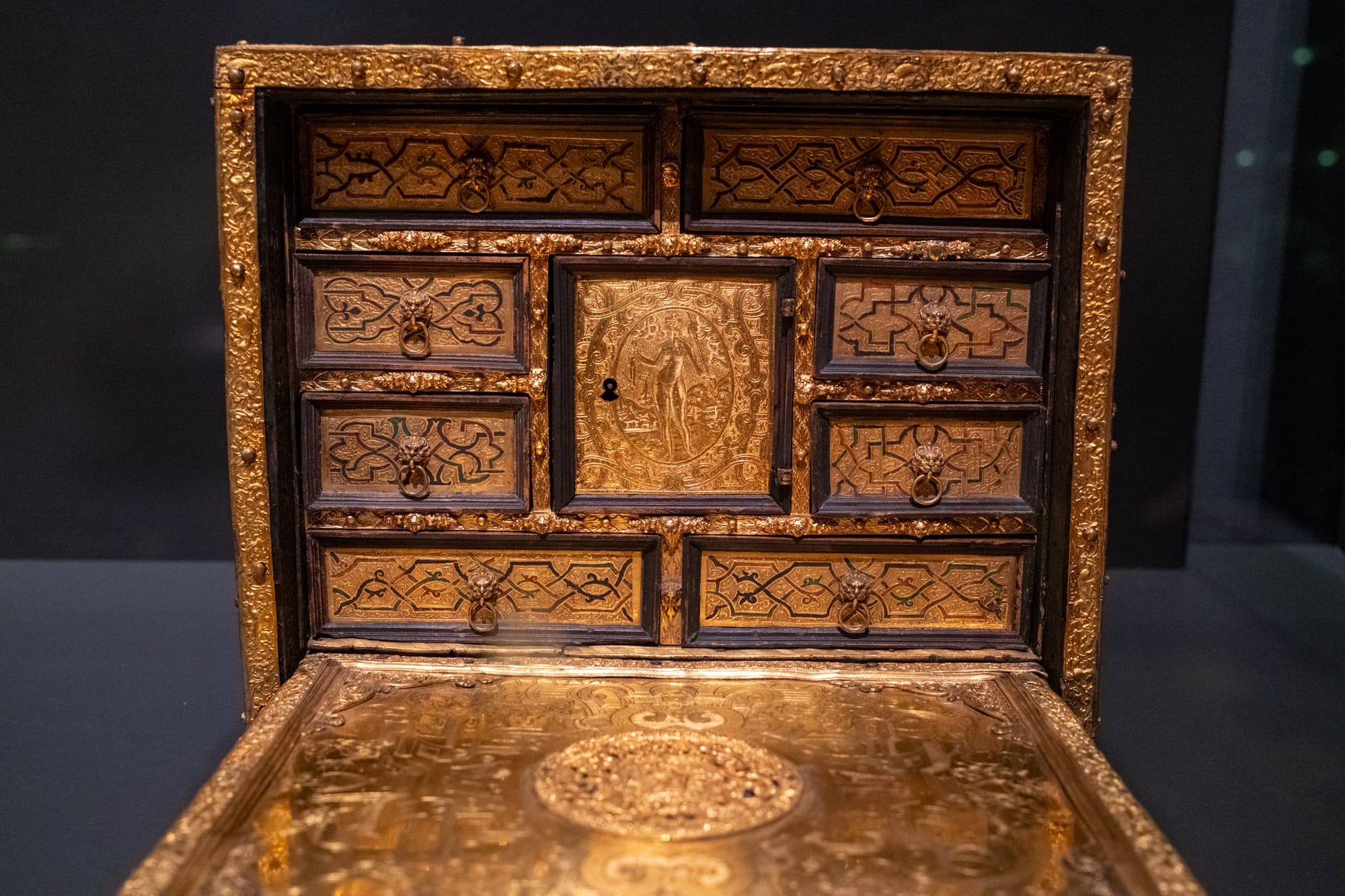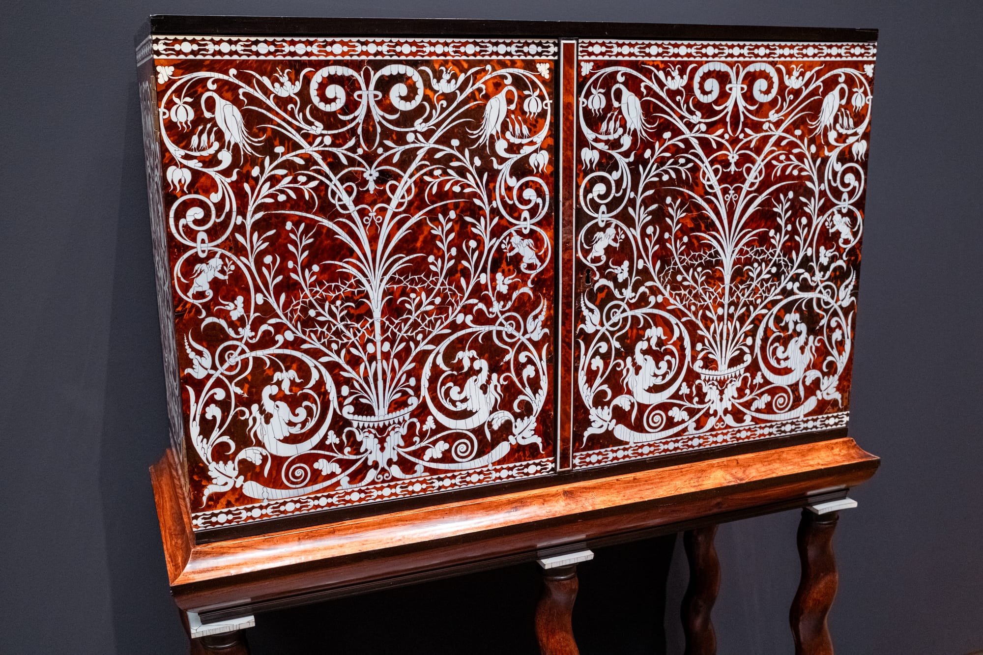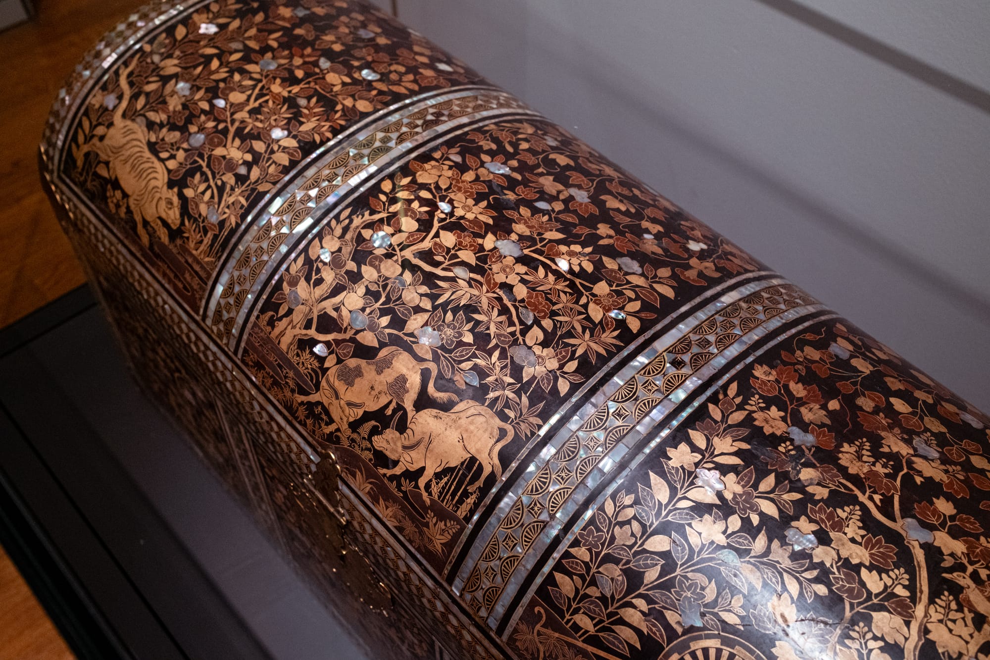 La marqueterie exposée impressionne par la finesse de son travail, avec des motifs minutieux et des assemblages de bois d’une précision remarquable.