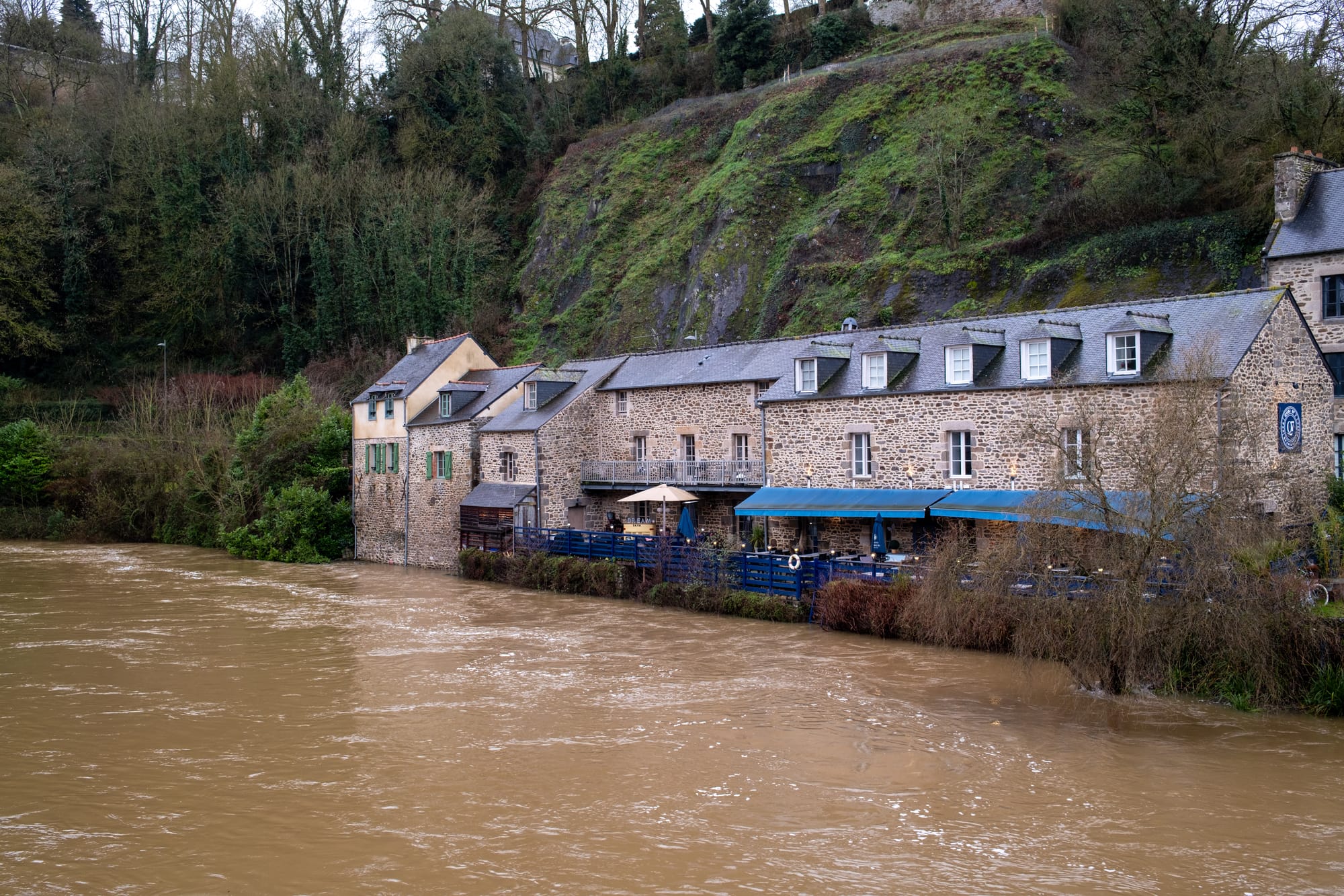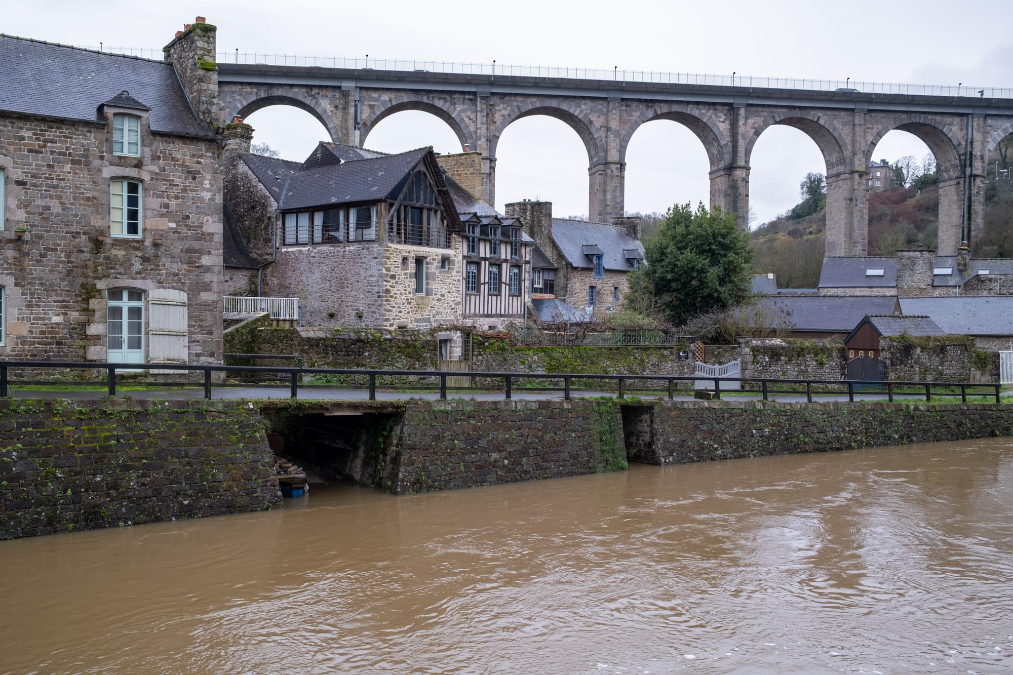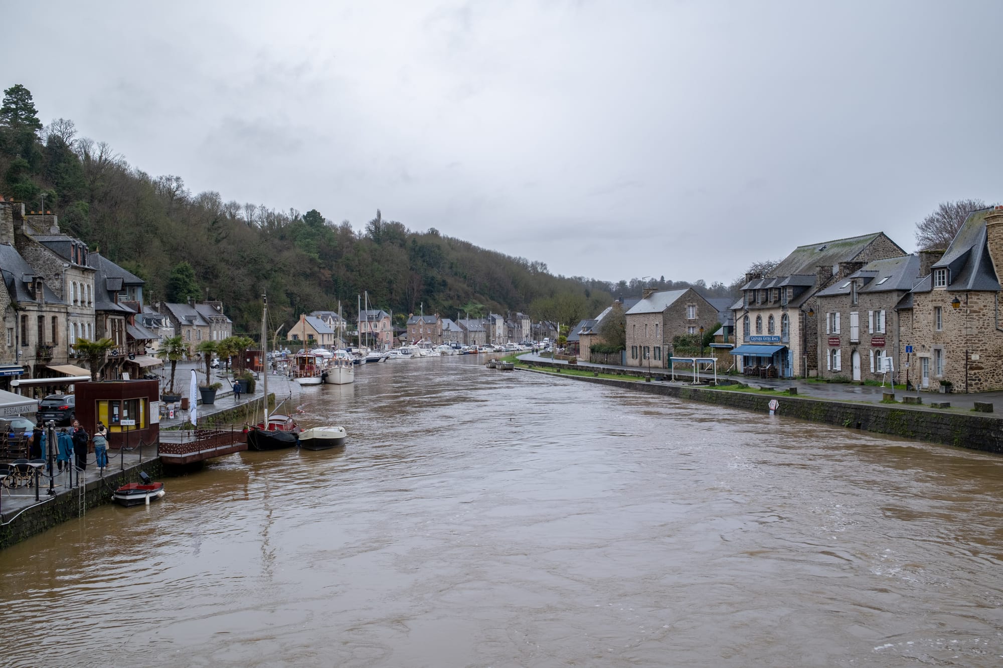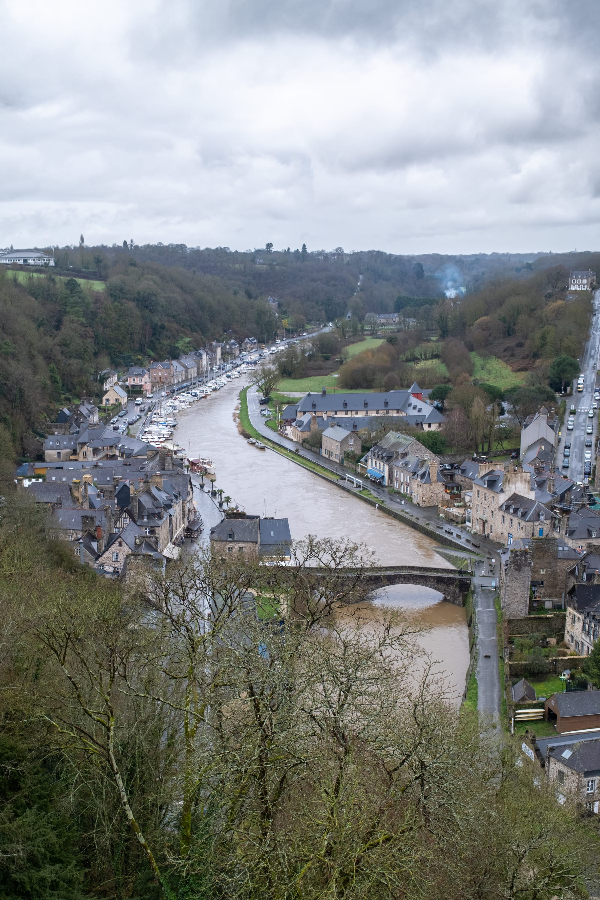 Nous sommes ensuite arrivés dans la ville basse de Dinan, le long de la La Rance. Avec les fortes pluies des jours — voire des semaines — précédentes, le niveau de l’eau était assez élevé. Le port et les quais avaient une atmosphère calme ce jour-là, accentuée par la météo et le peu de visiteurs en cette saison.