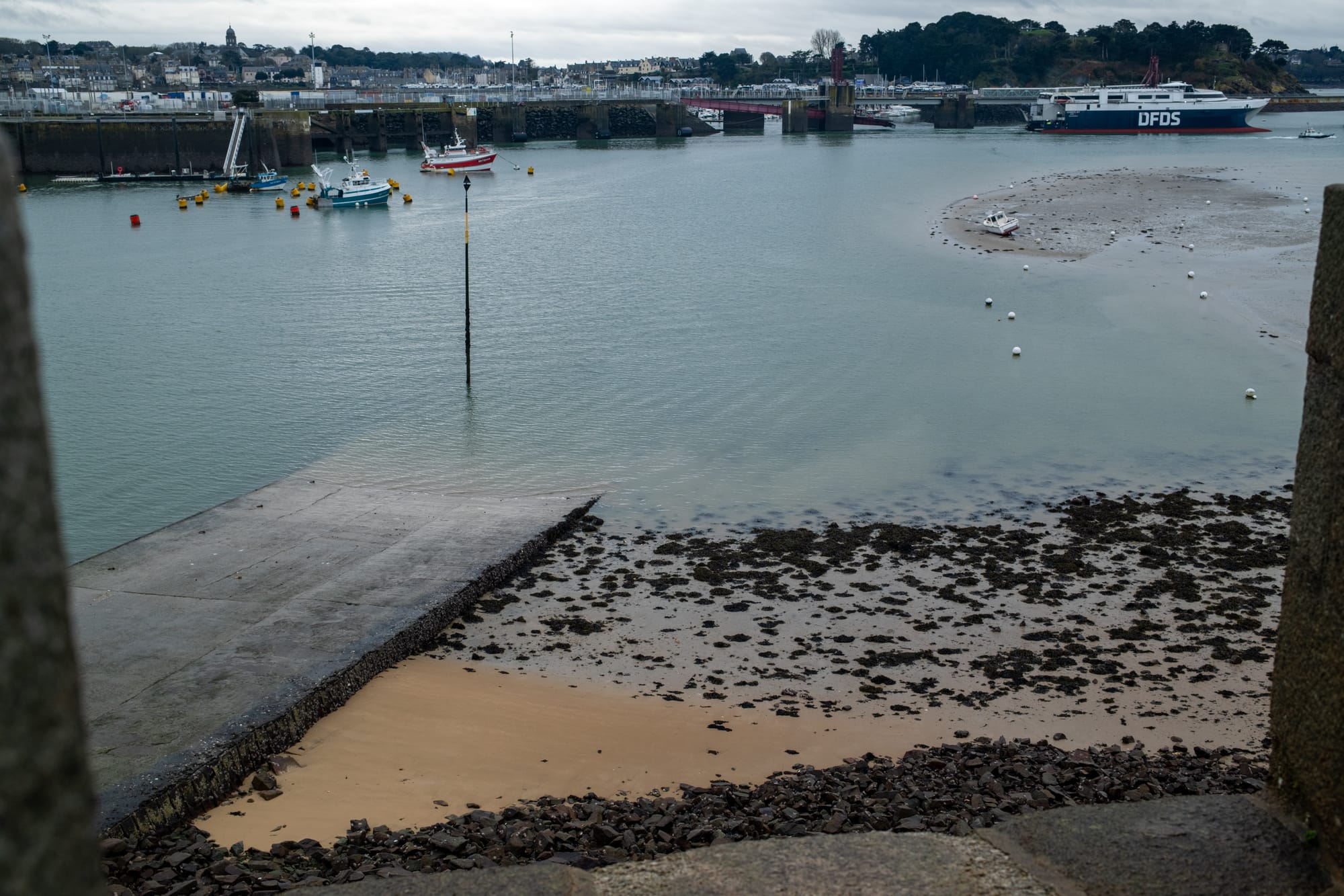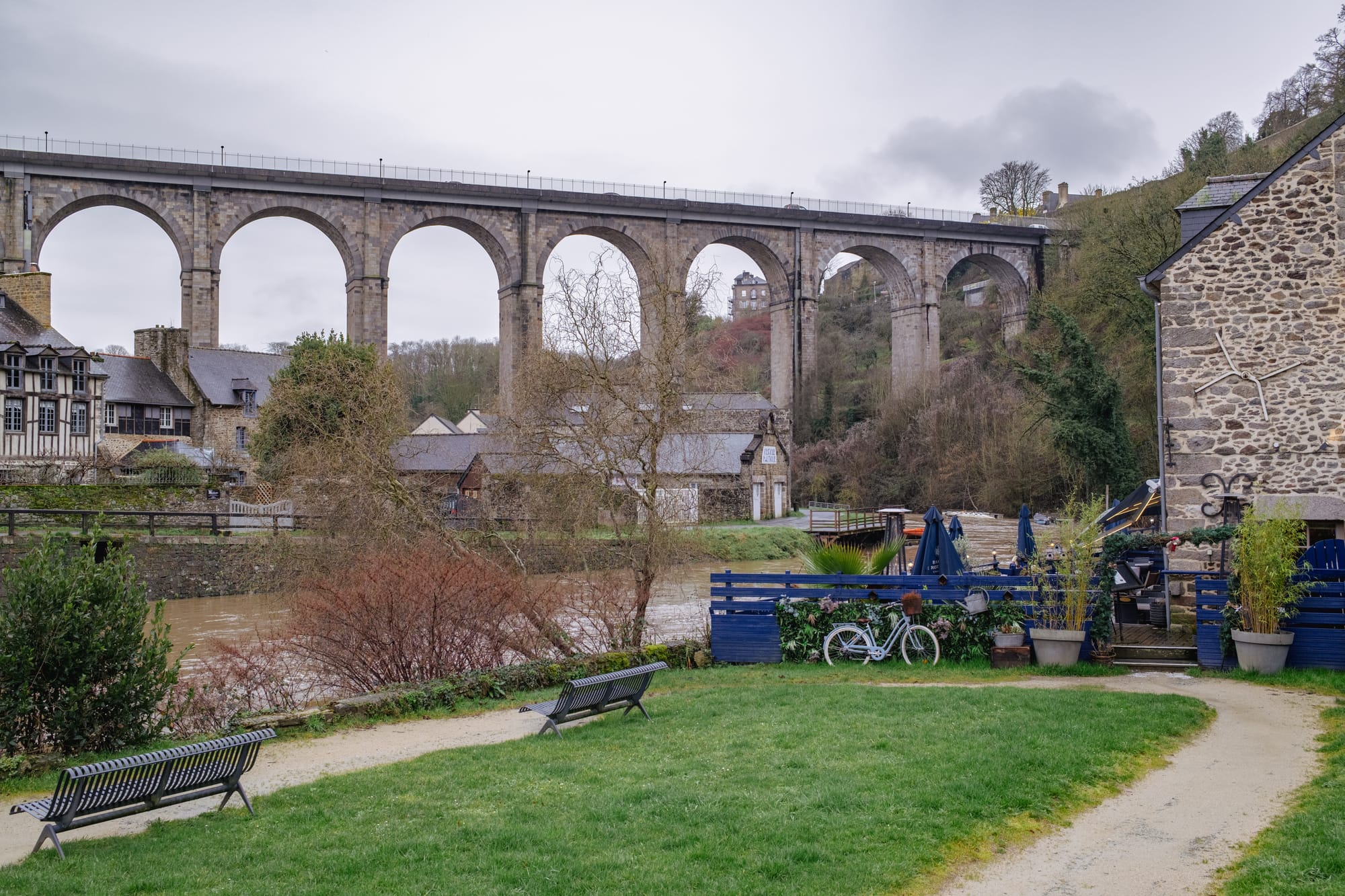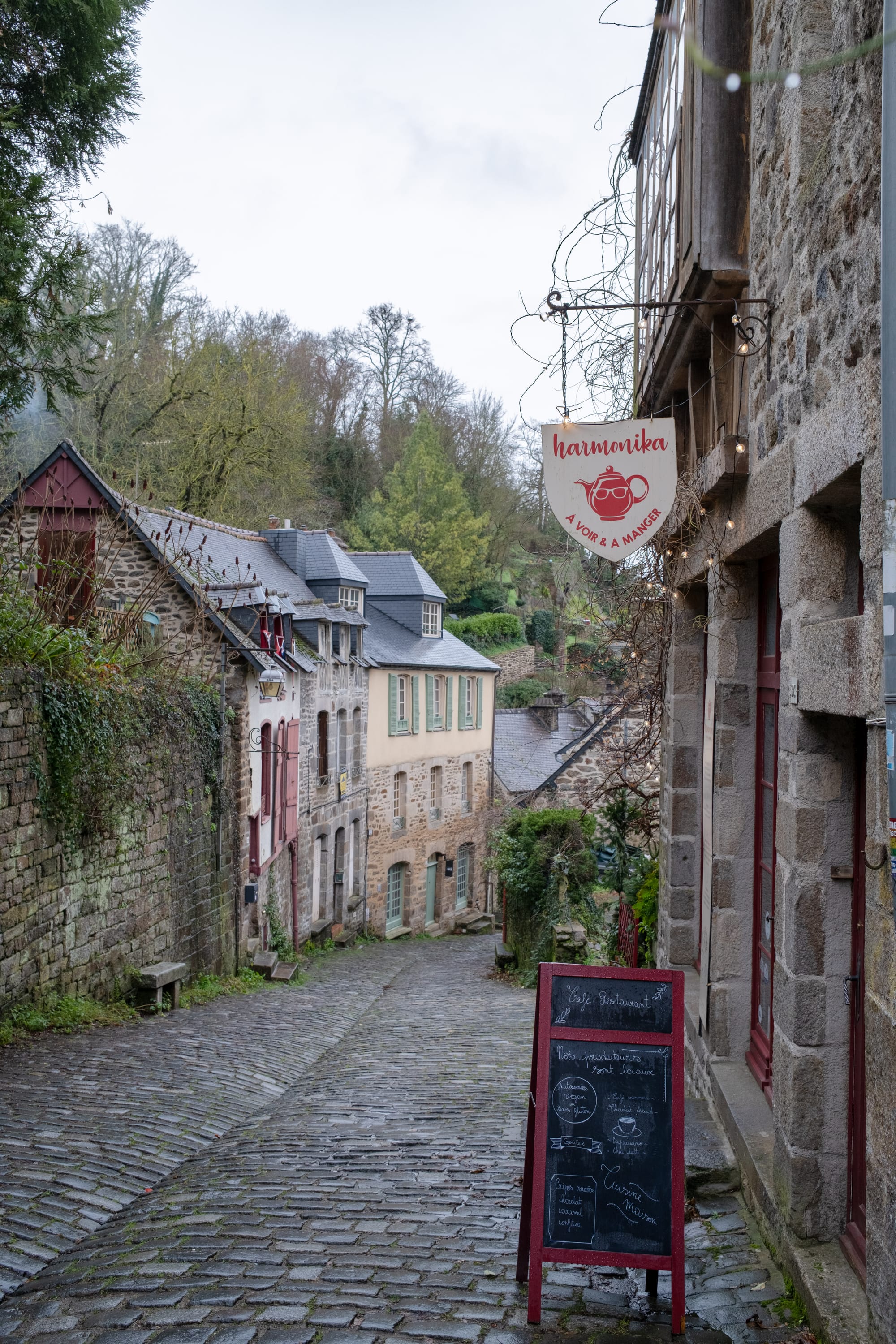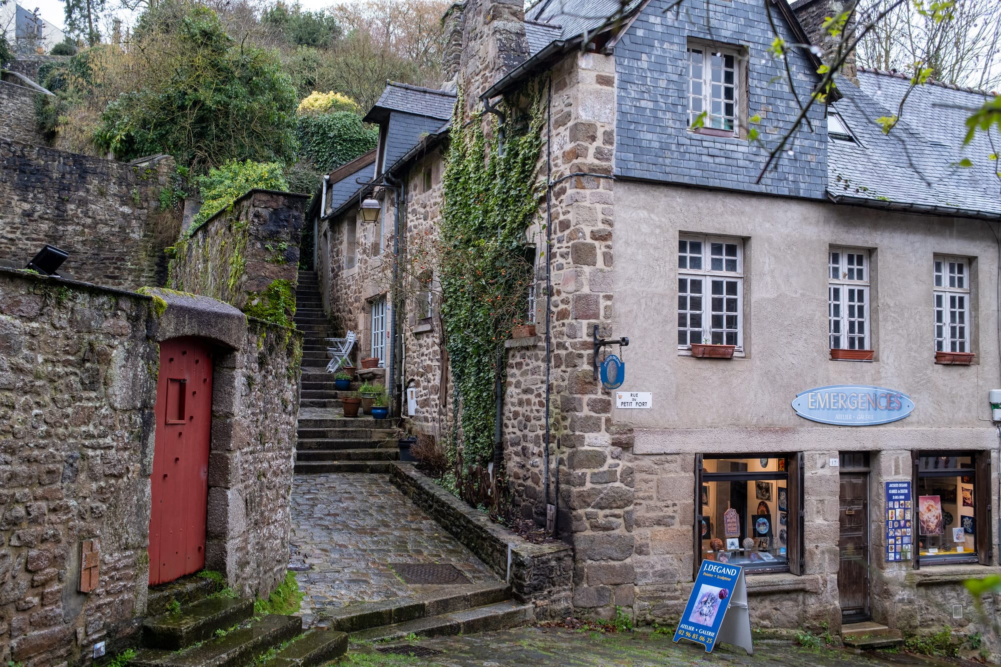 Nous sommes ensuite arrivés dans la ville basse de Dinan, le long de la La Rance. Avec les fortes pluies des jours — voire des semaines — précédentes, le niveau de l’eau était assez élevé. Le port et les quais avaient une atmosphère calme ce jour-là, accentuée par la météo et le peu de visiteurs en cette saison.