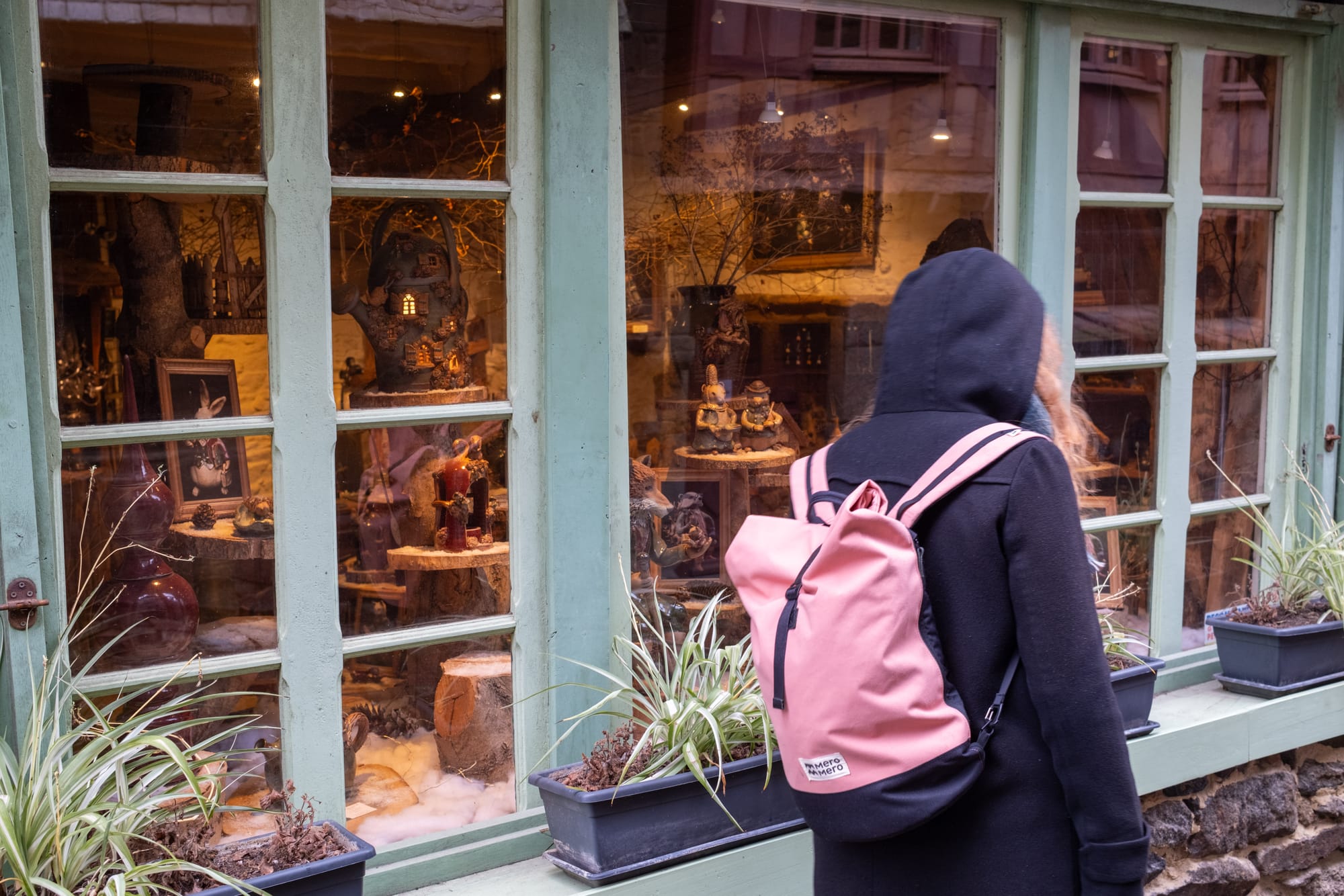 Cette rue pavée et très pentue relie la ville haute au port, bordée de maisons anciennes, d’ateliers d’artisans et de petites boutiques. Même sous la pluie, la descente avait beaucoup de charme, avec les façades en pierre et les pavés brillants qui donnaient une atmosphère particulière aux photos.