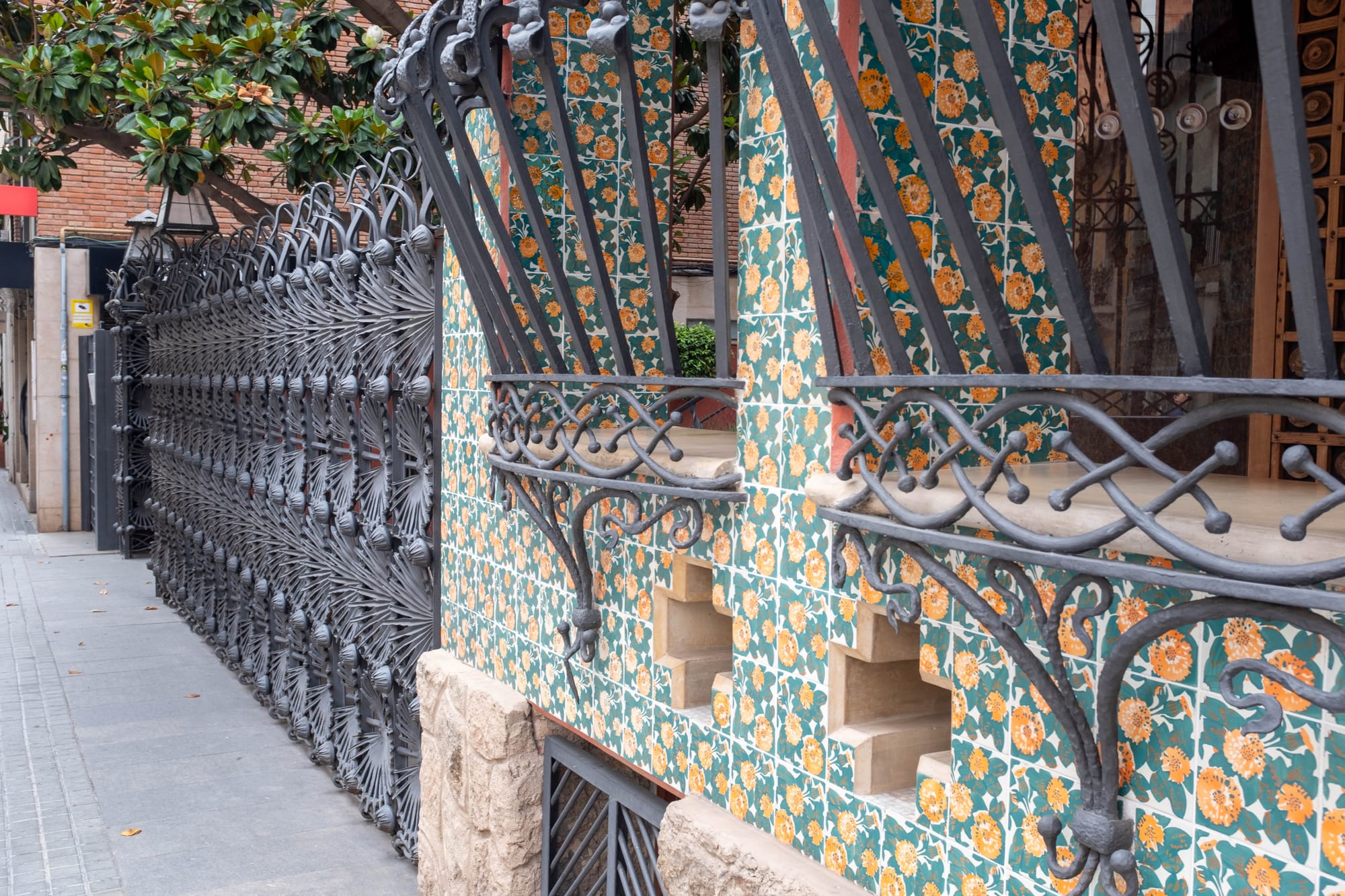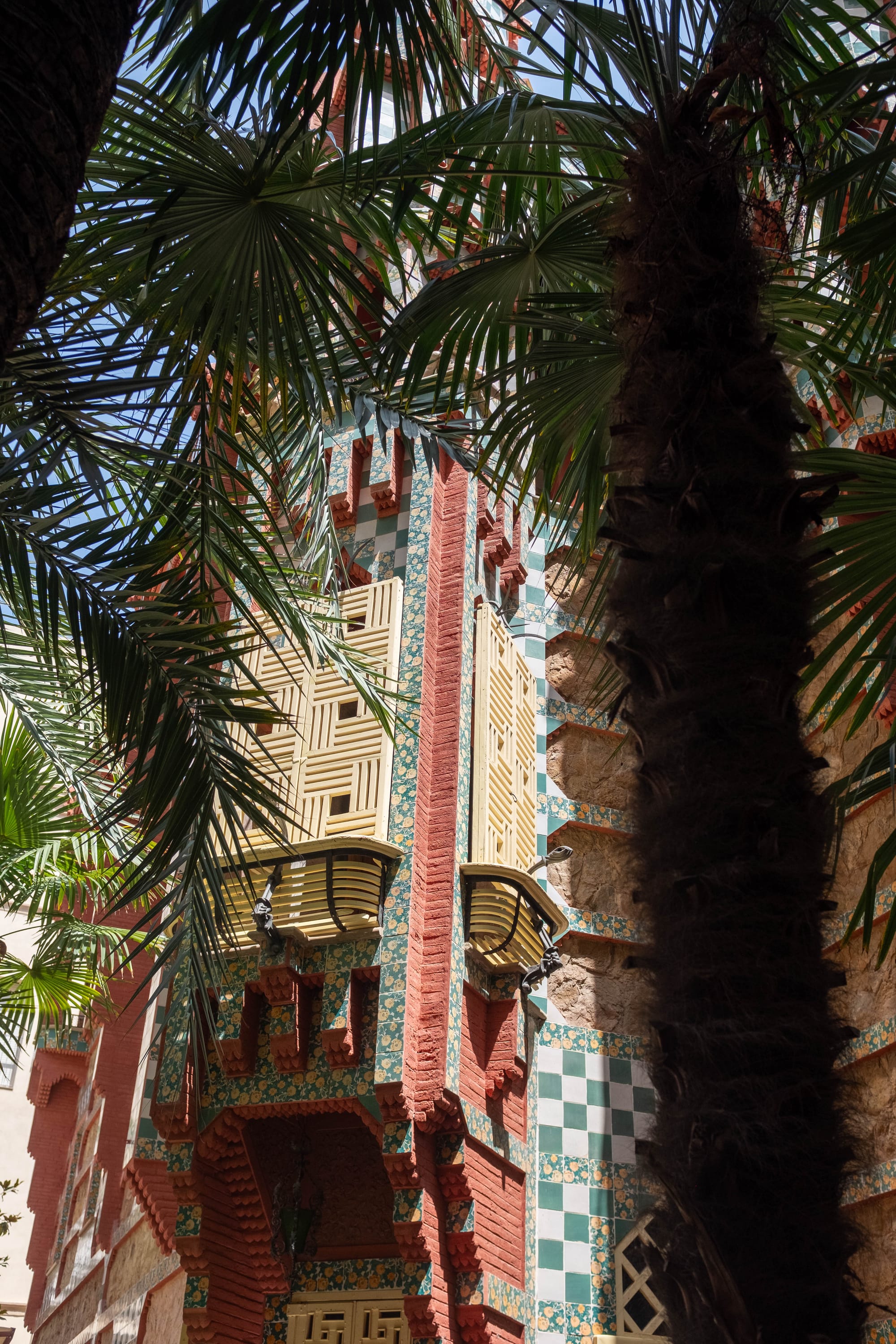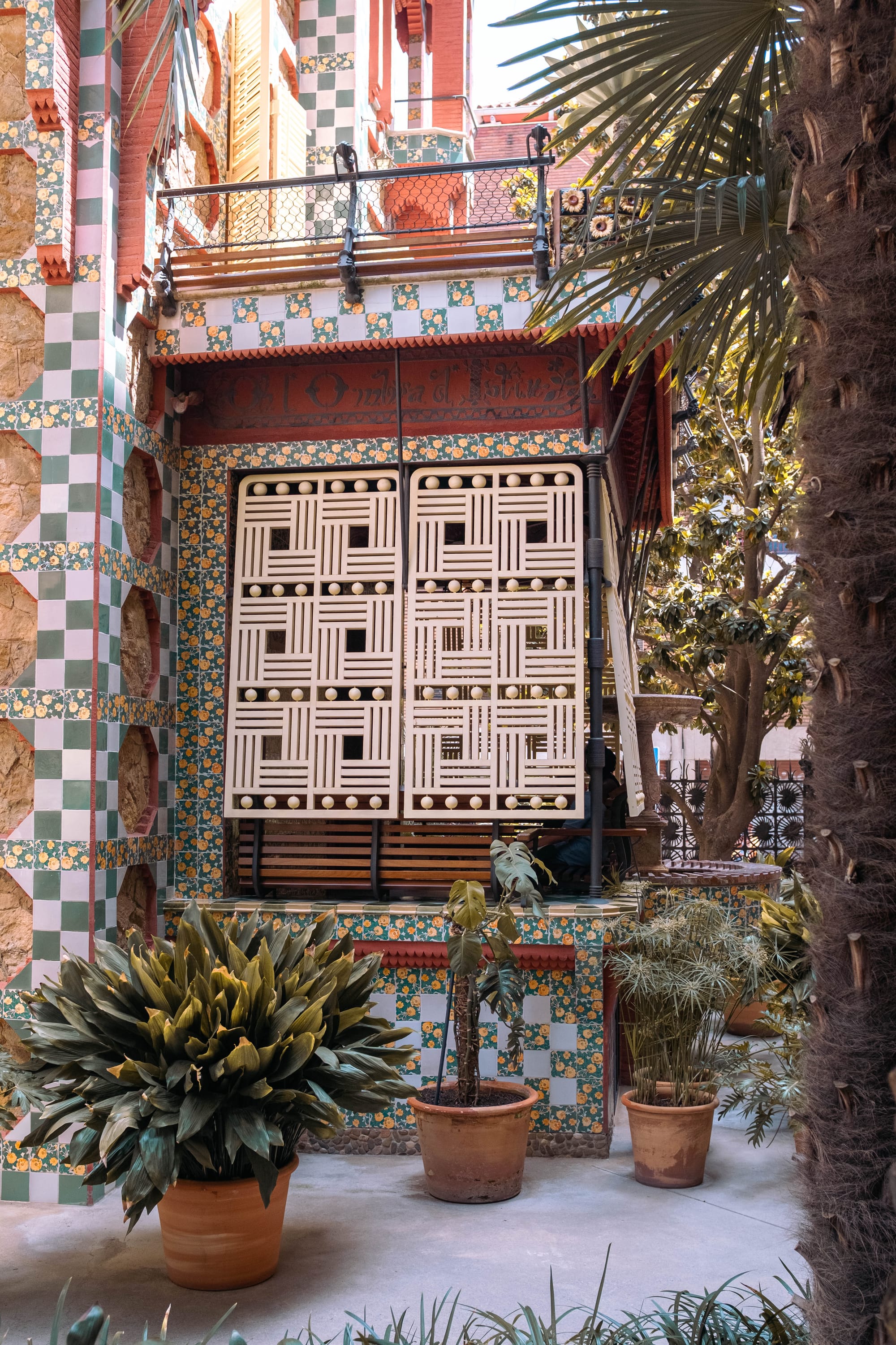À l’extérieur, la Casa Vicens est tout aussi spectaculaire que son intérieur. La façade, rythmée par des carreaux de céramique aux motifs floraux verts et blancs, se mêle à des briques rouges et des éléments de fer forgé pour créer un ensemble vibrant et audacieux. Le jardin, bien que plus réduit qu’à l’époque de sa construction, permet de prendre du recul et d’admirer les volumes originaux de la maison, avec ses balcons, ses tourelles et ses formes asymétriques. Un lieu où l’on perçoit déjà l’inventivité de Gaudí et son goût pour l’harmonie entre architecture et nature.
