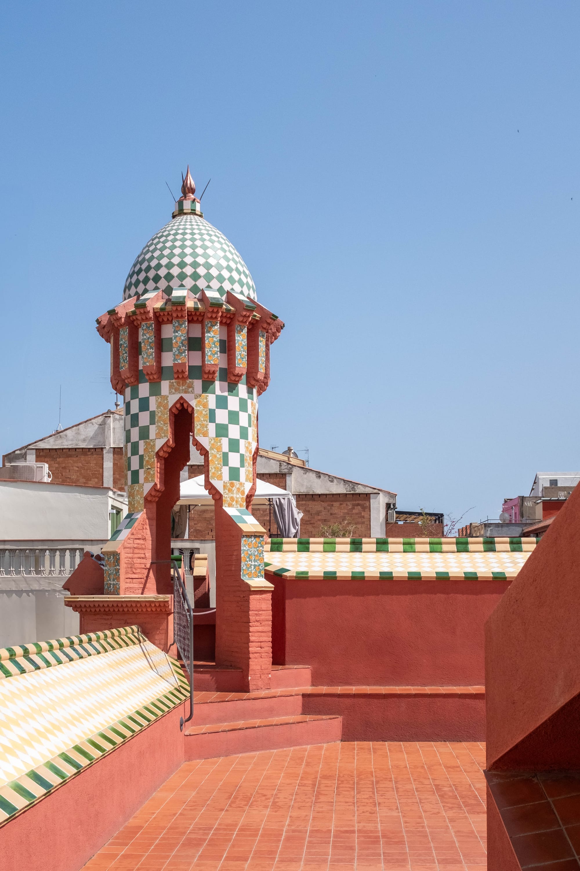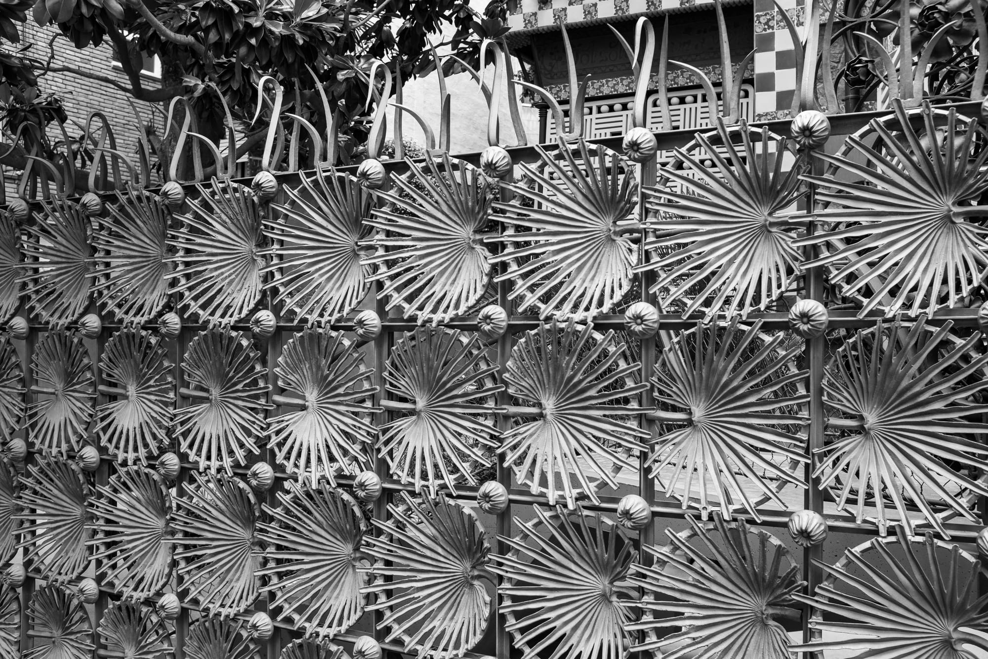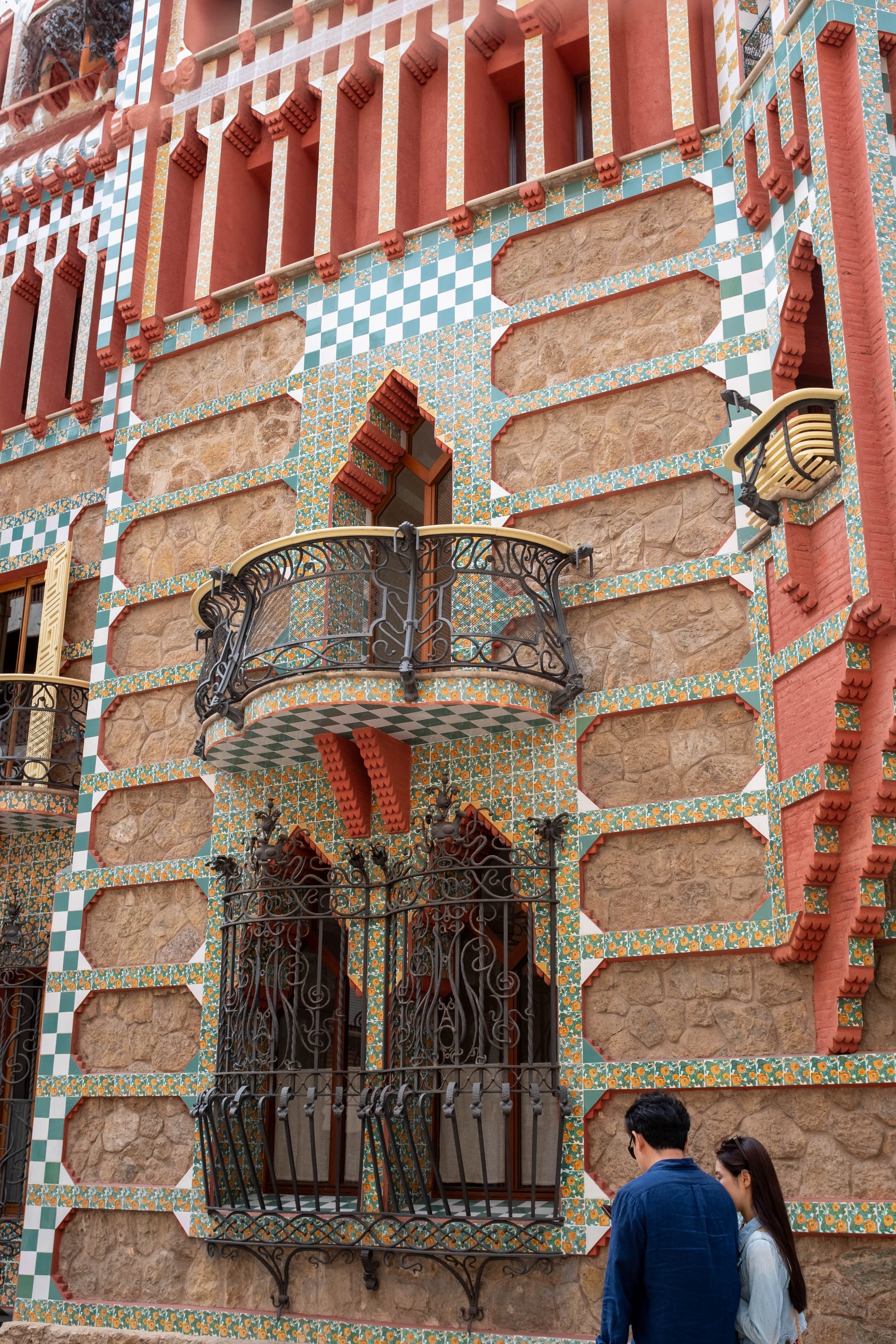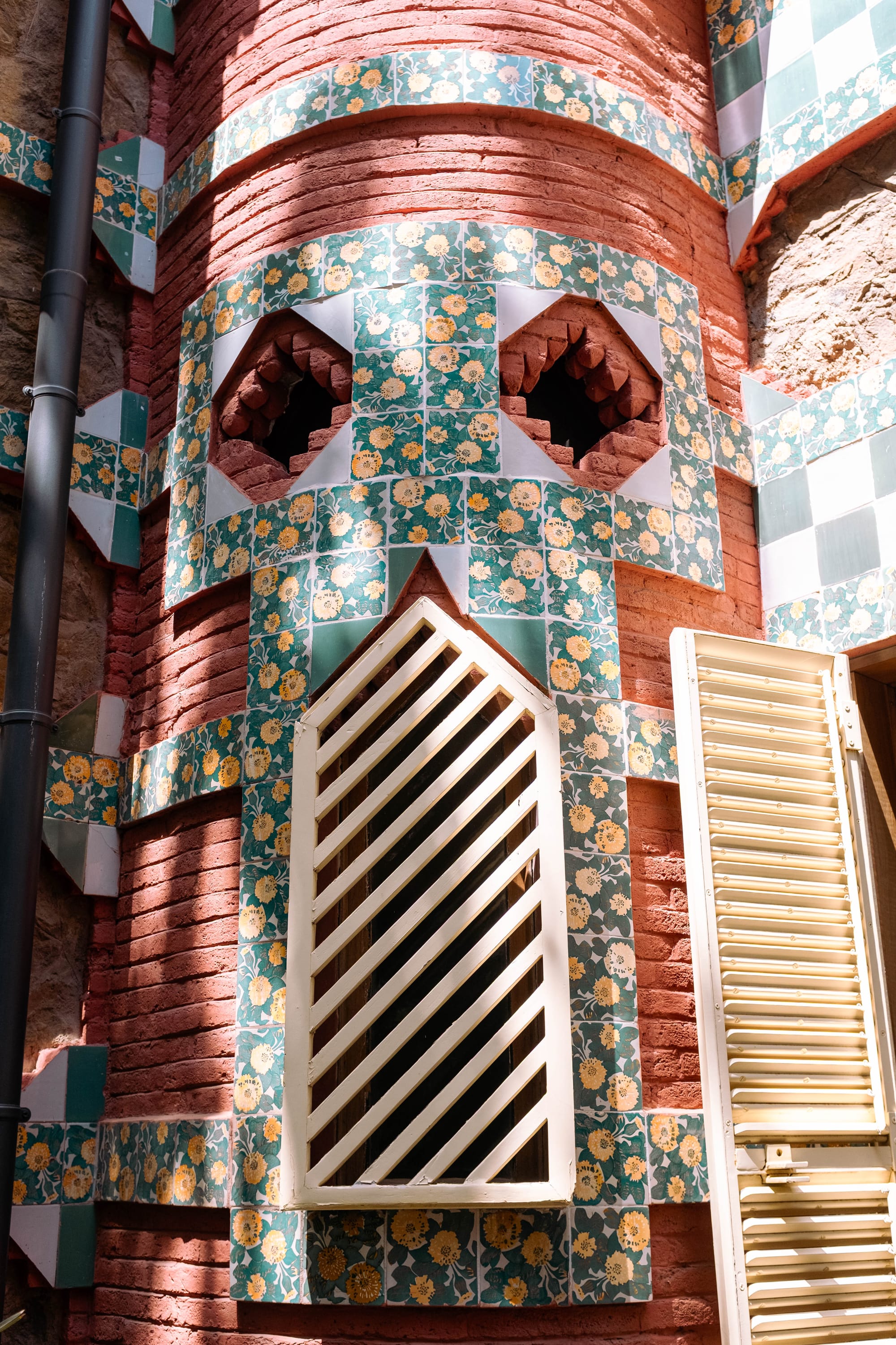 À l’extérieur, la Casa Vicens est tout aussi spectaculaire que son intérieur. La façade, rythmée par des carreaux de céramique aux motifs floraux verts et blancs, se mêle à des briques rouges et des éléments de fer forgé pour créer un ensemble vibrant et audacieux. Le jardin, bien que plus réduit qu’à l’époque de sa construction, permet de prendre du recul et d’admirer les volumes originaux de la maison, avec ses balcons, ses tourelles et ses formes asymétriques. Un lieu où l’on perçoit déjà l’inventivité de Gaudí et son goût pour l’harmonie entre architecture et nature.