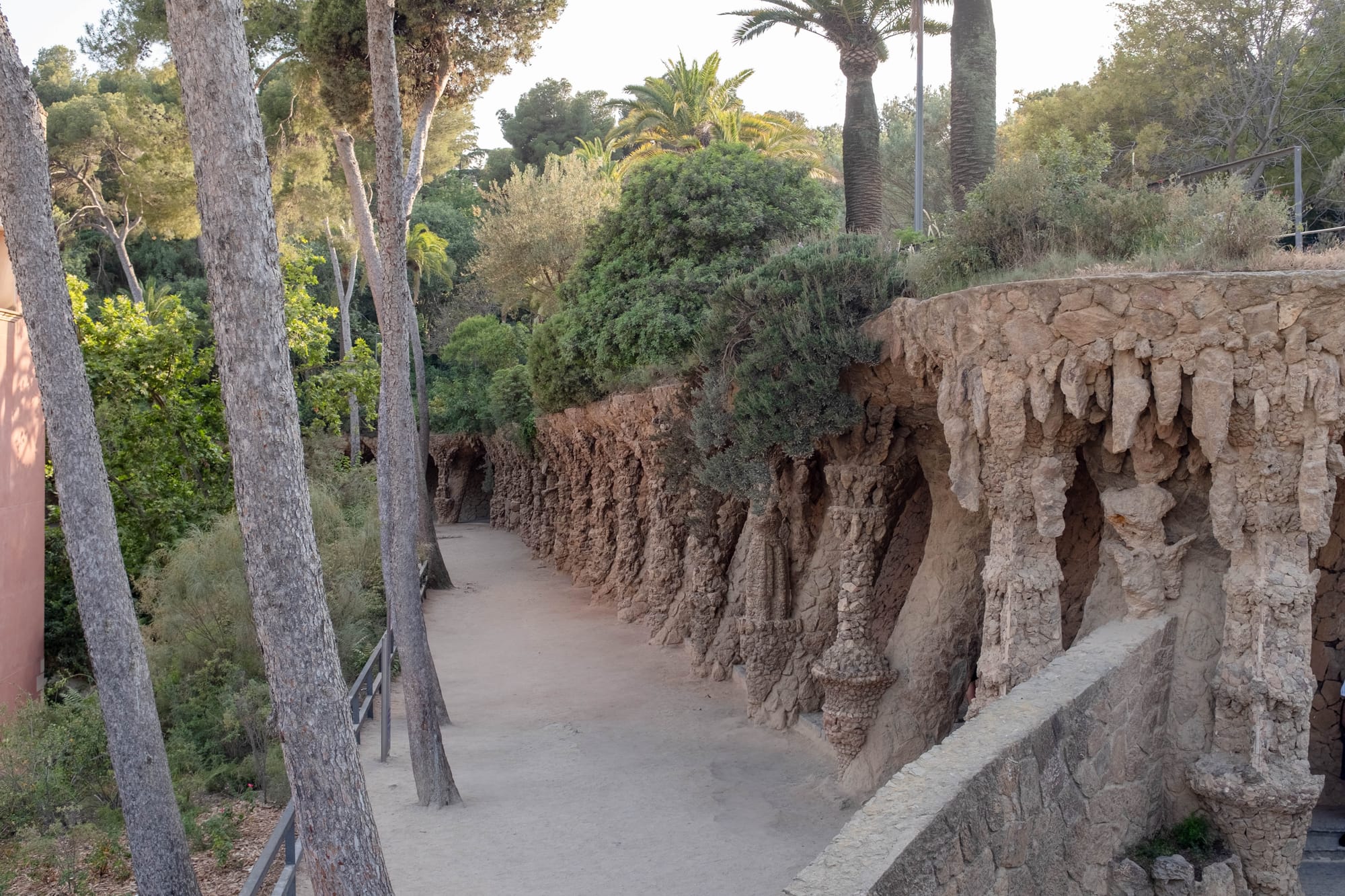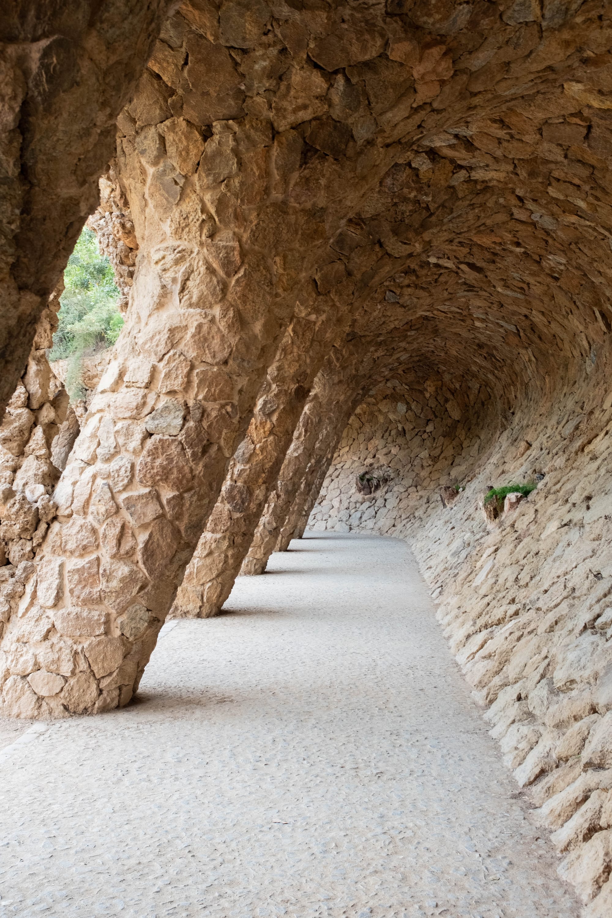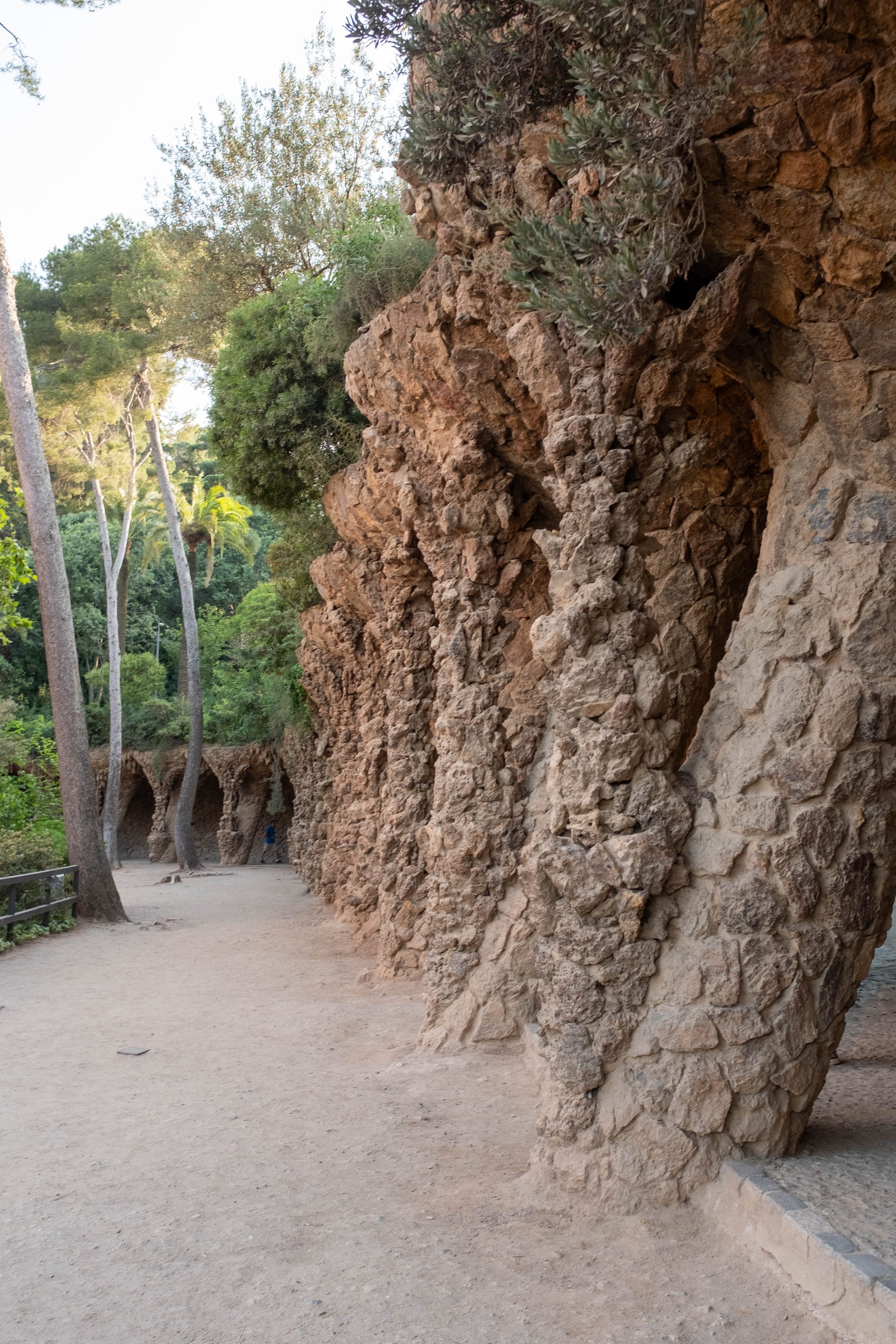 En descendant vers l’entrée monumentale du parc, nous avons traversé le célèbre Porche de la Lavandière, l’une des parties les plus singulières de l’œuvre de Gaudí. Ses colonnes inclinées, rappelant des troncs d’arbres pétrifiés, créent une atmosphère à la fois naturelle et architecturale. La lumière dorée de fin de journée glissait entre les ouvertures, soulignant les textures de pierre et donnant au lieu une dimension presque théâtrale. Un passage à la fois ombragé et spectaculaire, qui illustre parfaitement la façon dont Gaudí mêlait nature, structure et mise en scène.