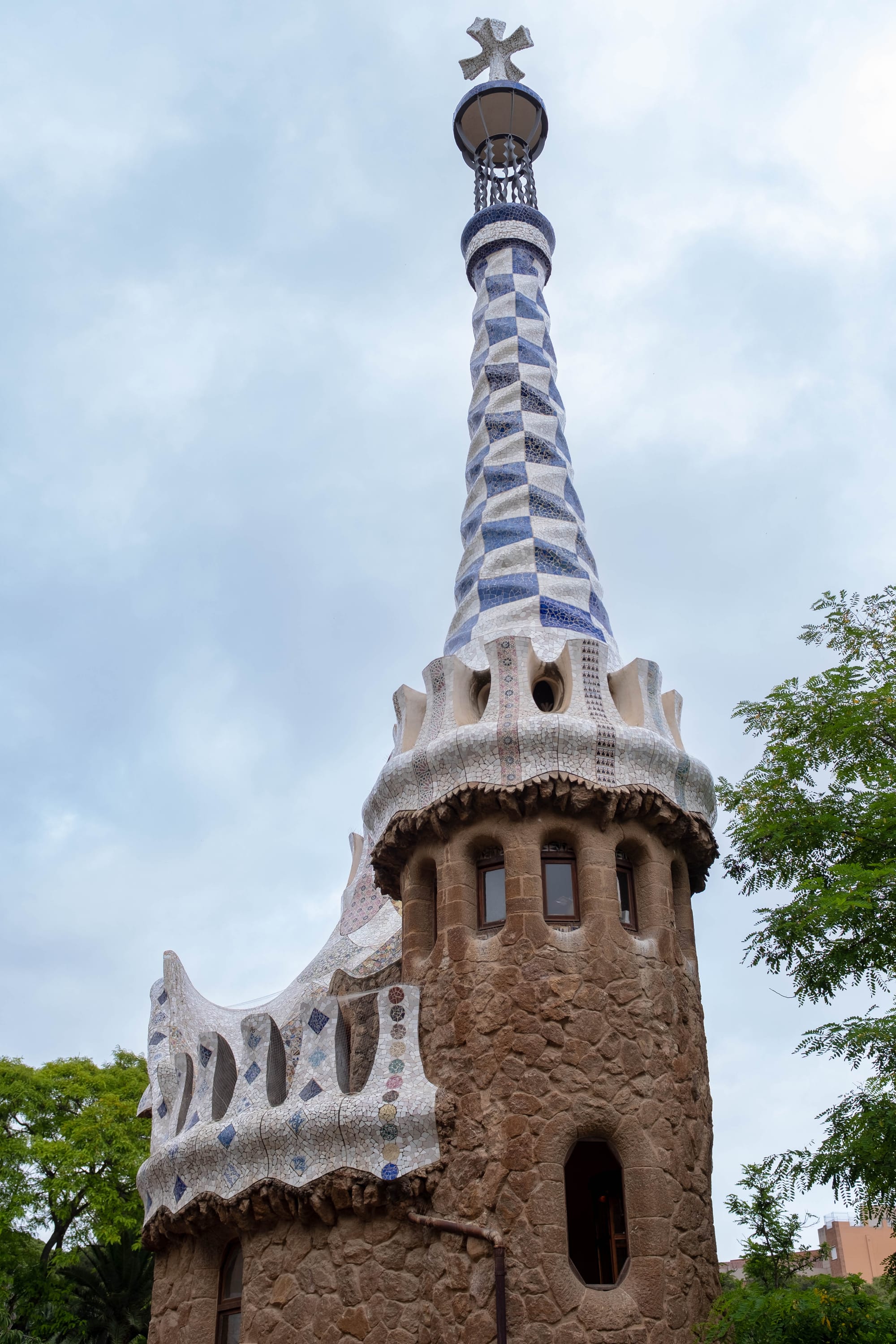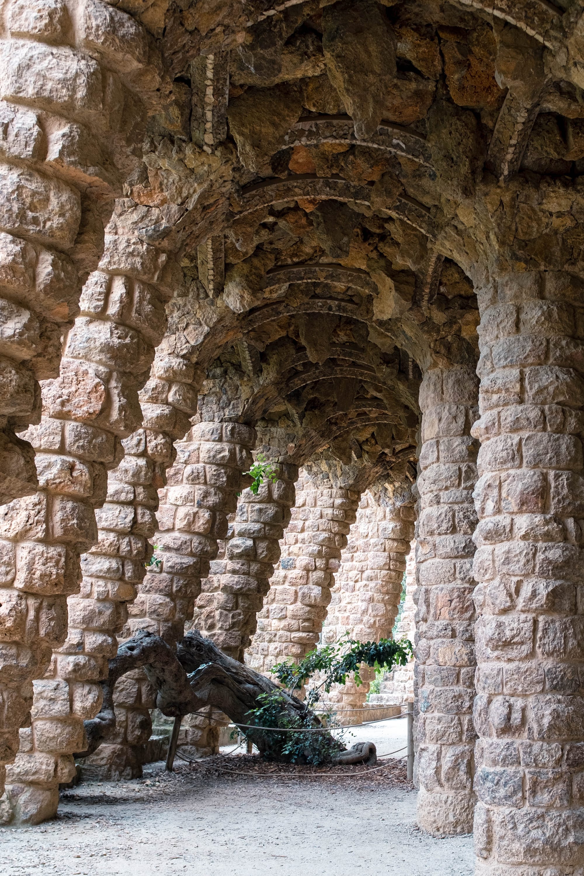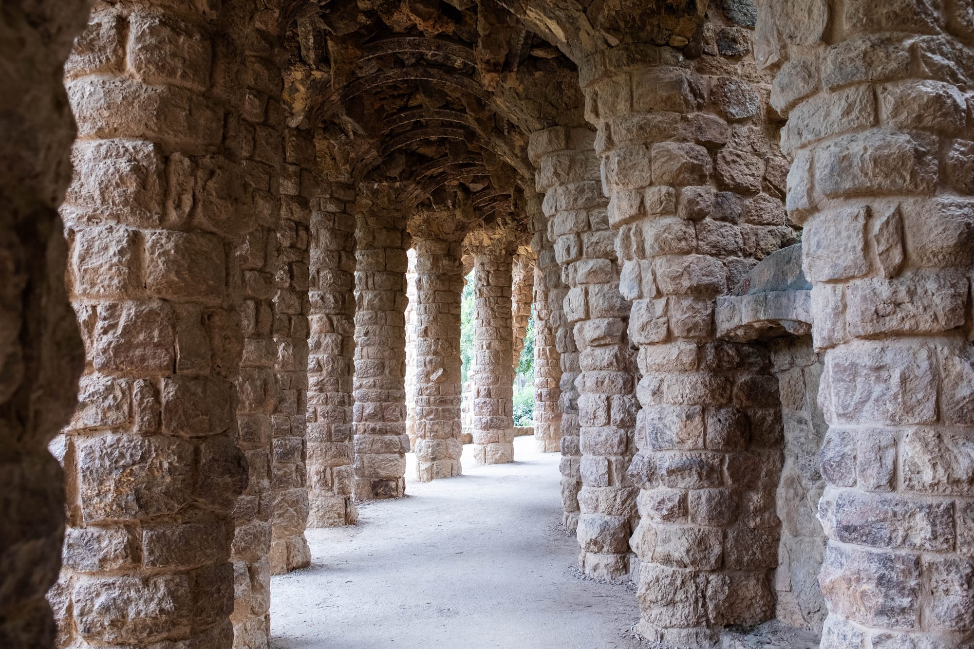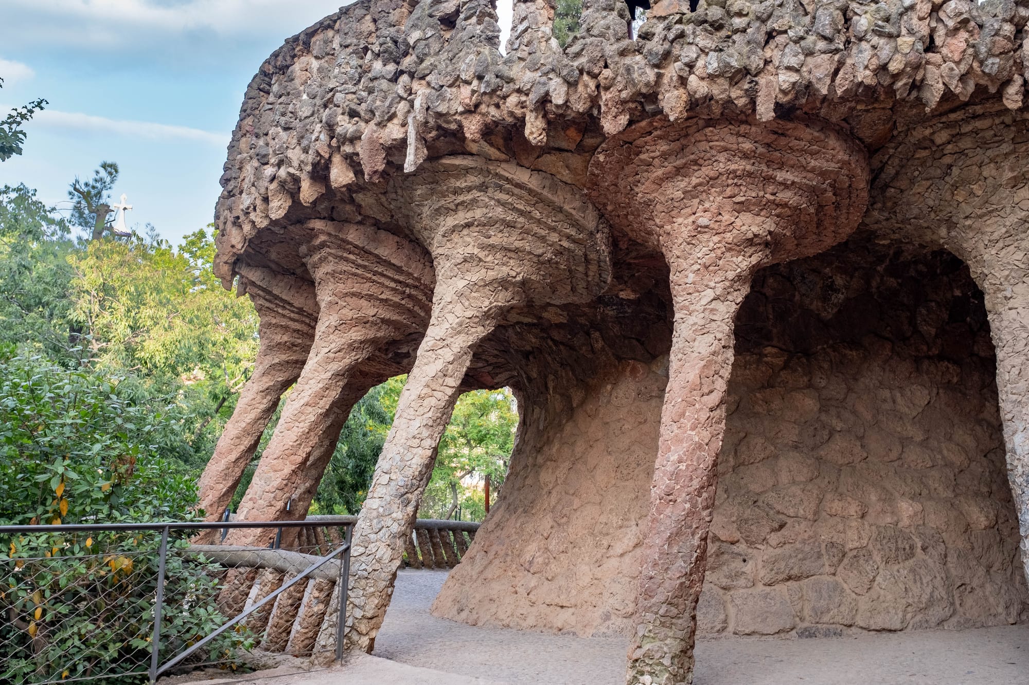 En descendant vers l’entrée monumentale du parc, nous avons traversé le célèbre Porche de la Lavandière, l’une des parties les plus singulières de l’œuvre de Gaudí. Ses colonnes inclinées, rappelant des troncs d’arbres pétrifiés, créent une atmosphère à la fois naturelle et architecturale. La lumière dorée de fin de journée glissait entre les ouvertures, soulignant les textures de pierre et donnant au lieu une dimension presque théâtrale. Un passage à la fois ombragé et spectaculaire, qui illustre parfaitement la façon dont Gaudí mêlait nature, structure et mise en scène.