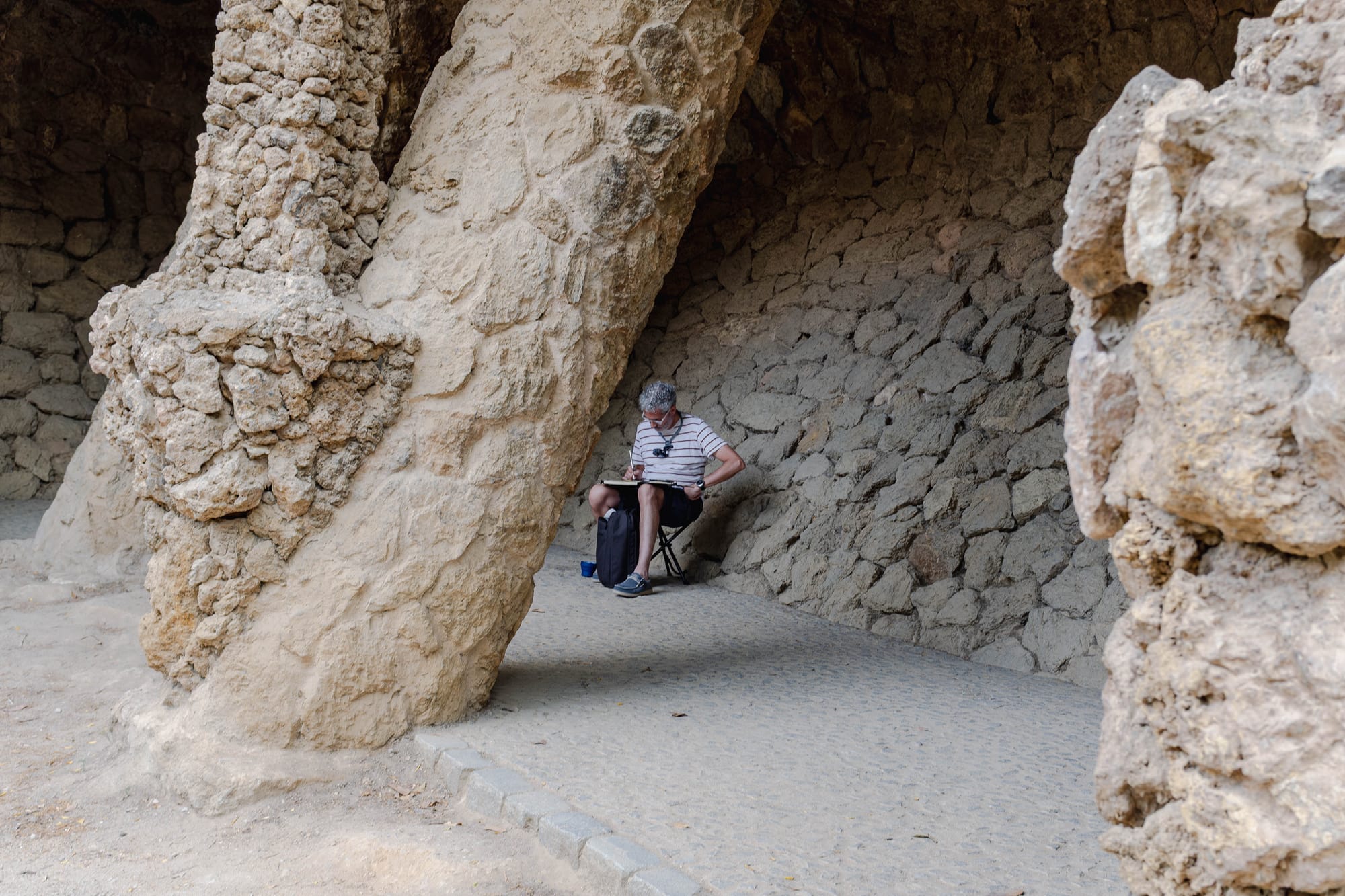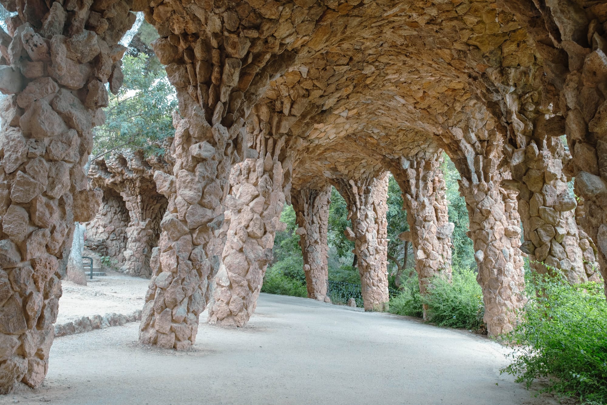 Au Parc Güell, en plus des célèbres mosaïques et de la maison de Gaudí, nous avons emprunté les trois viaducs imaginés par l’architecte : le Viaduc del Mig, le Viaduc de Baix et le Viaduc de Dalt. Ces passerelles de pierre, parfaitement intégrées au relief, permettent de circuler dans le parc tout en profitant de perspectives différentes sur la végétation et les courbes architecturales. Conçus pour s’harmoniser avec la nature environnante, ils offrent aussi de jolis points de vue sur Barcelone et constituent une autre facette du génie de Gaudí.