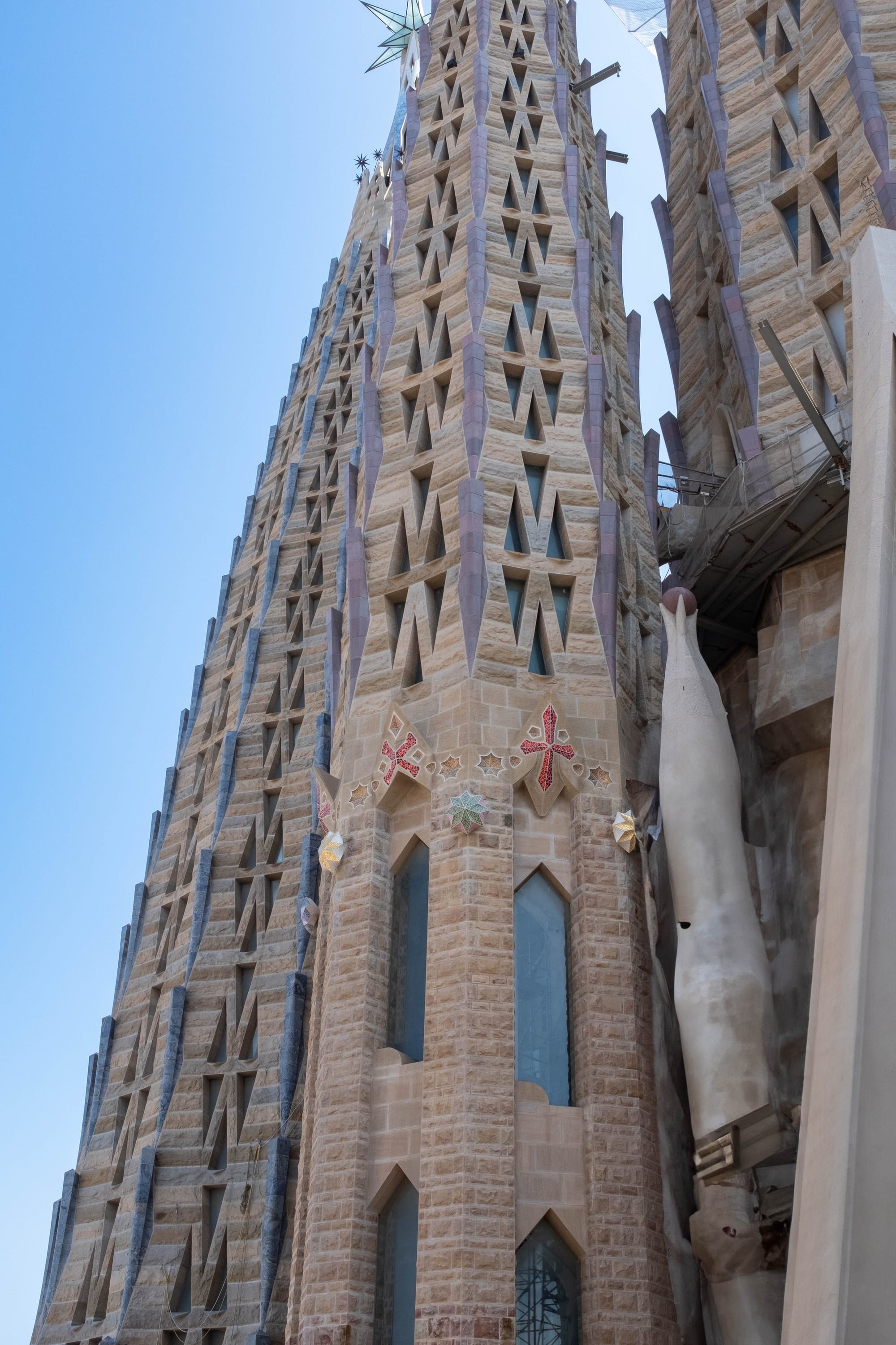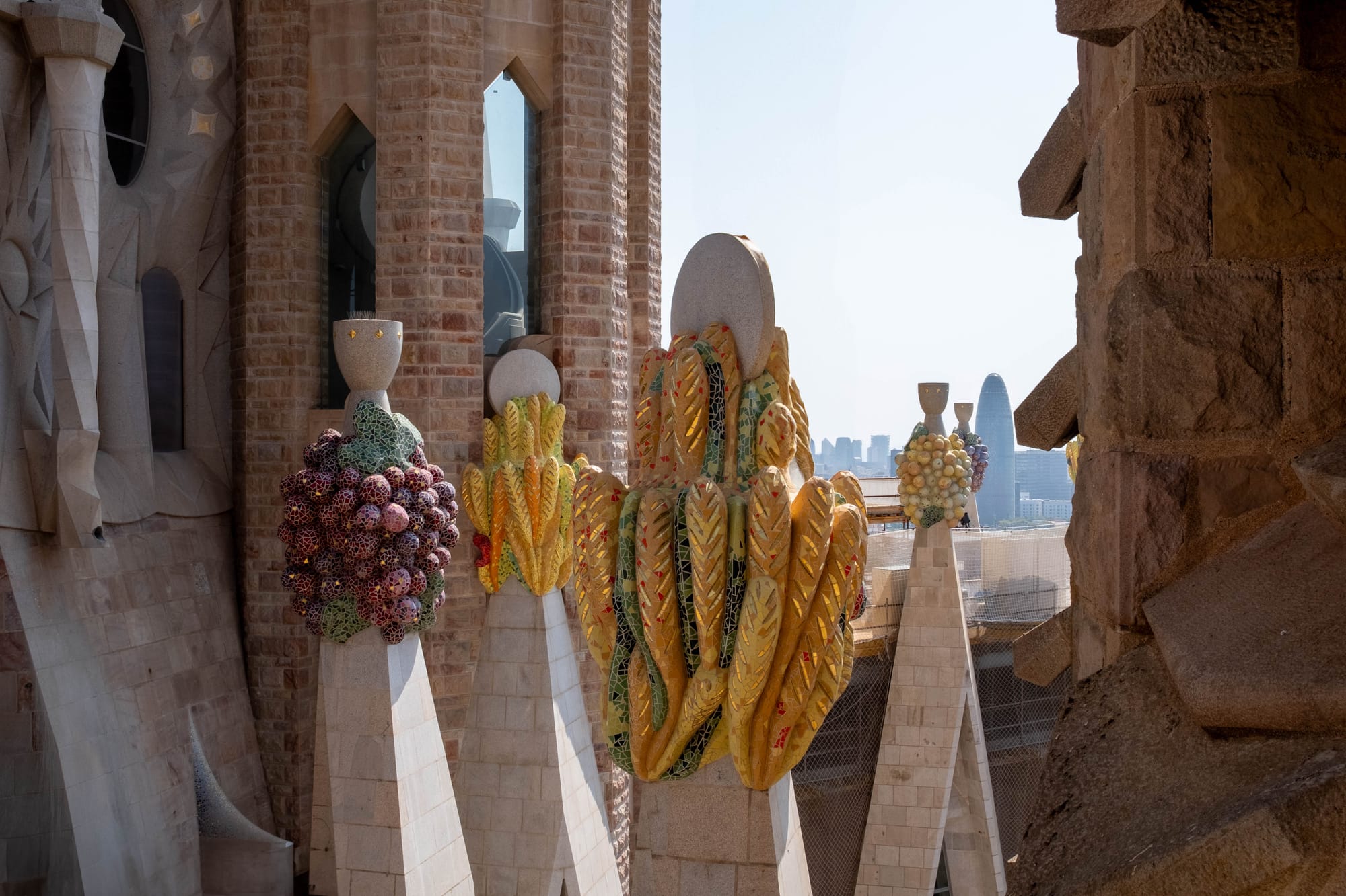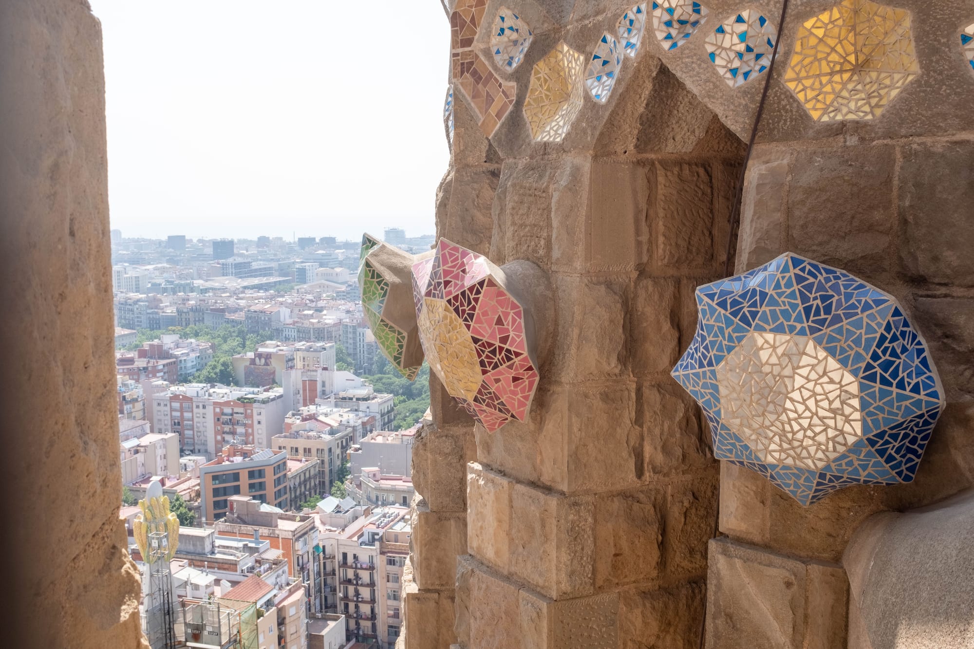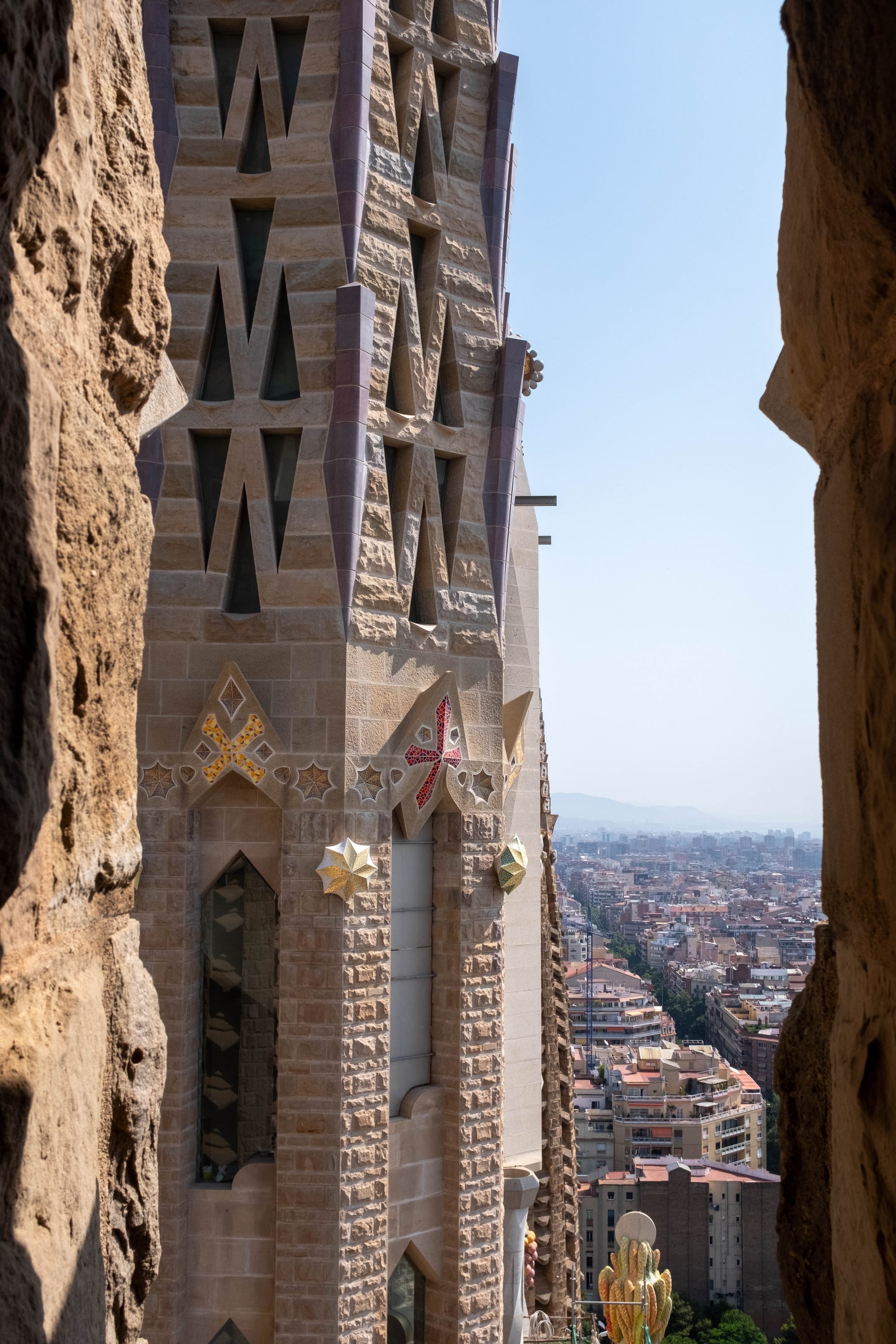 En prenant l'ascenseur pour monter en haut des tours, nous avons découvert une perspective unique sur les détails architecturaux souvent invisibles depuis le sol. De là-haut, on peut vraiment apprécier la finesse des sculptures, les jeux de lumière sur la pierre et la complexité des formes imaginées par Gaudí, tout en profitant d'un panorama spectaculaire sur Barcelone.