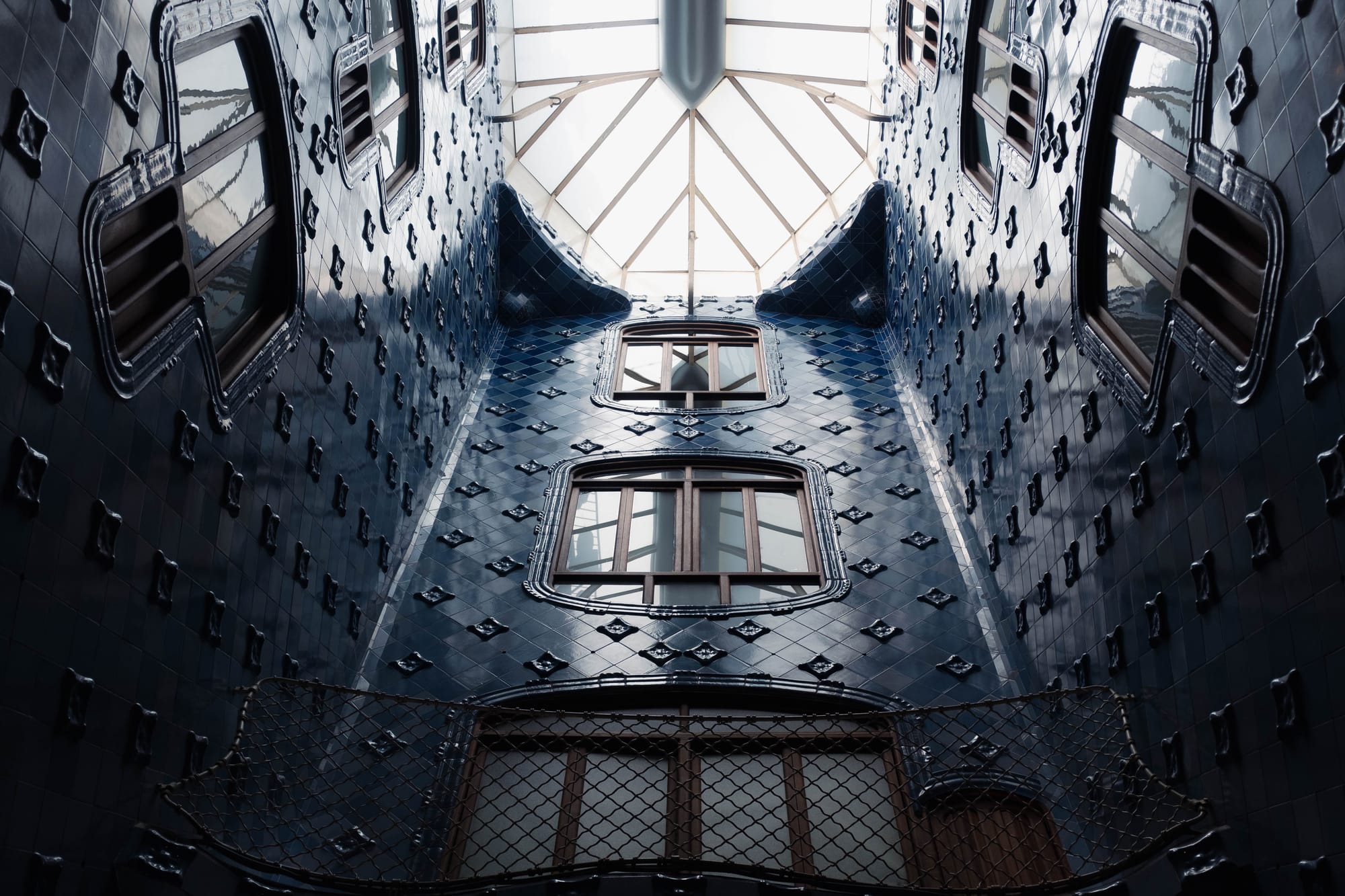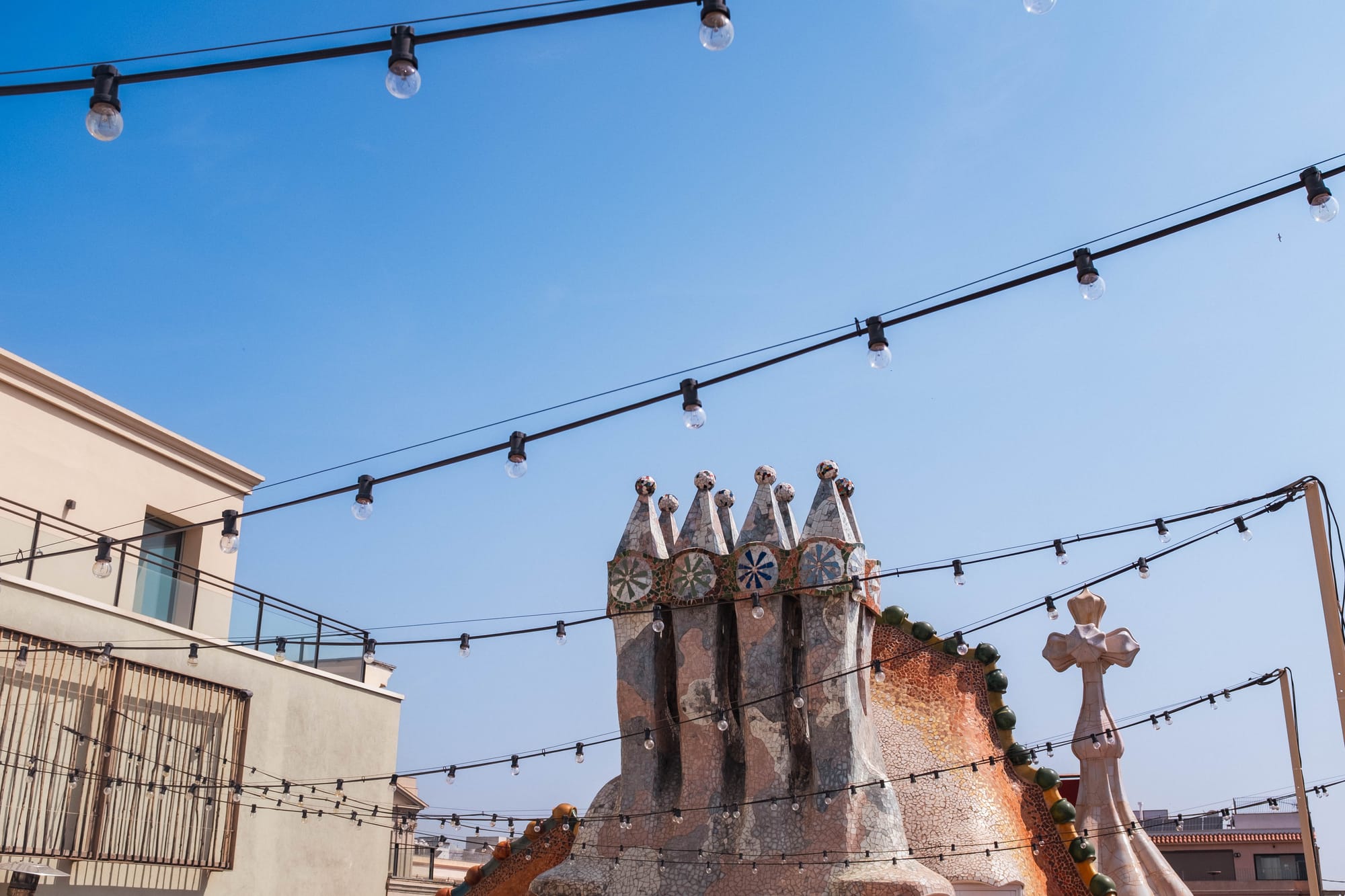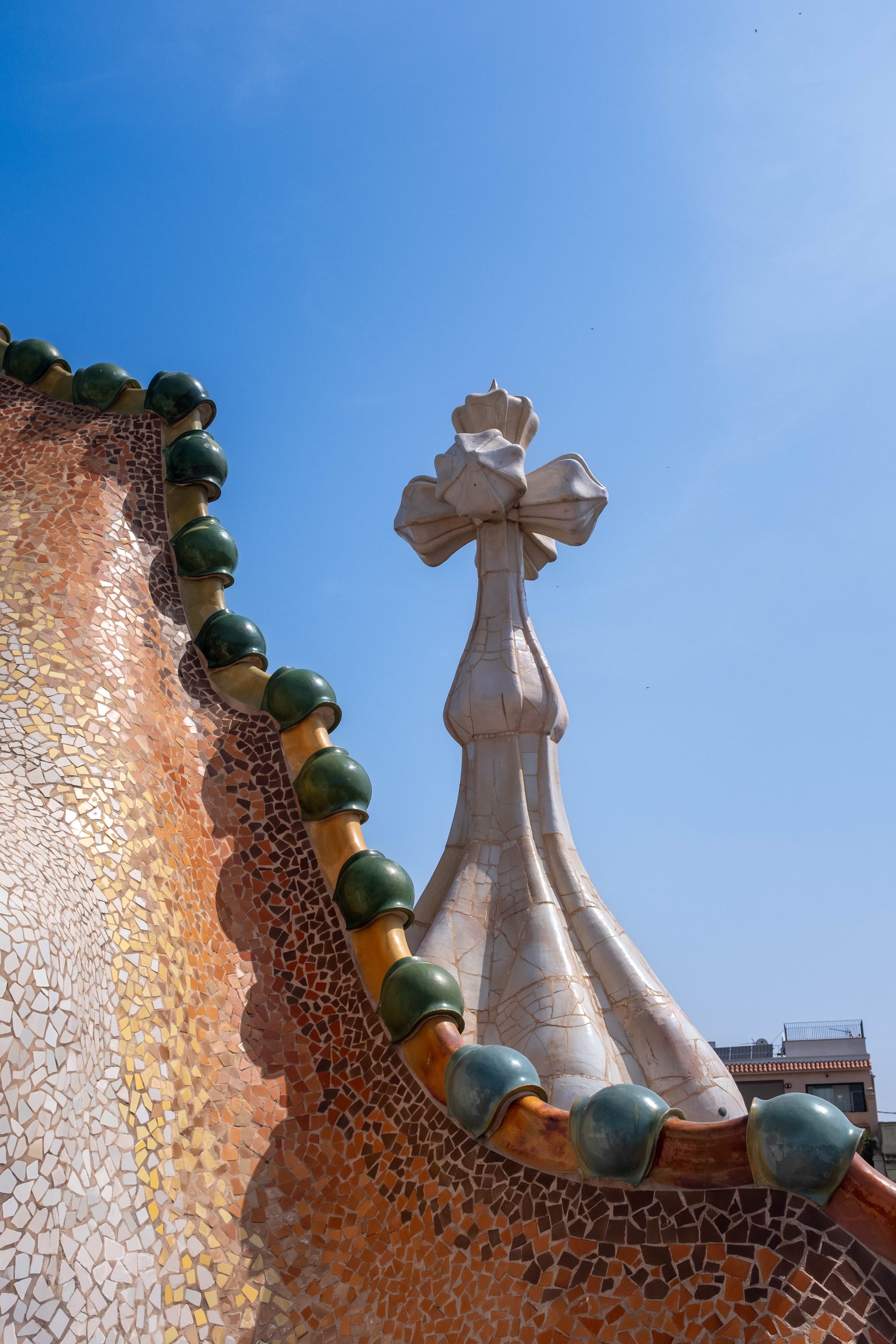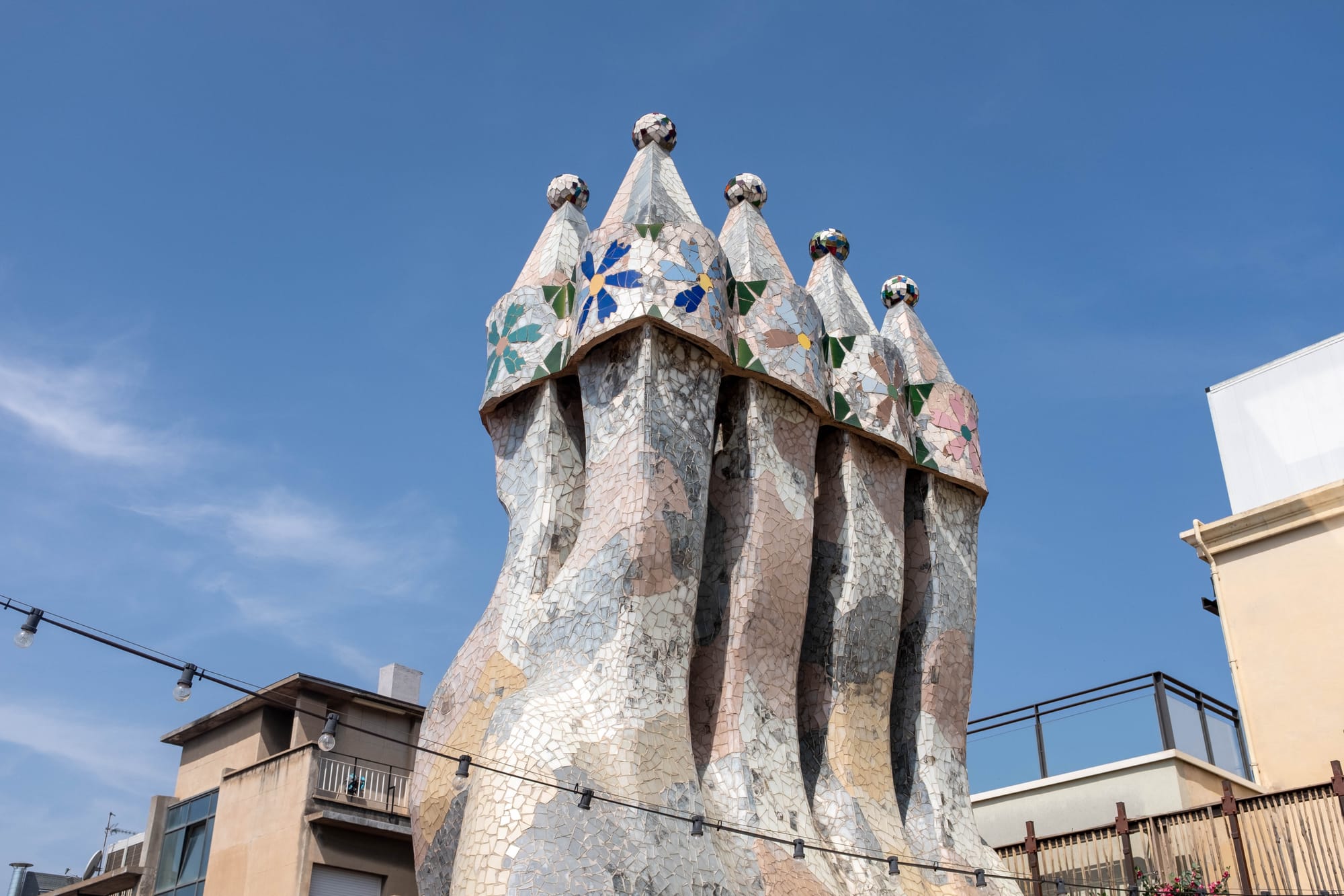 Le toit de la Casa Batlló est sans doute l’une de ses parties les plus emblématiques. Avec ses tuiles vernissées aux reflets irisés, il évoque l’échine d’un dragon, figure mythologique chère à Gaudí. Les cheminées, aux formes sculptées et aux couleurs vives, complètent ce décor presque fantastique, où l’architecture devient sculpture et où chaque détail nourrit l’imaginaire.