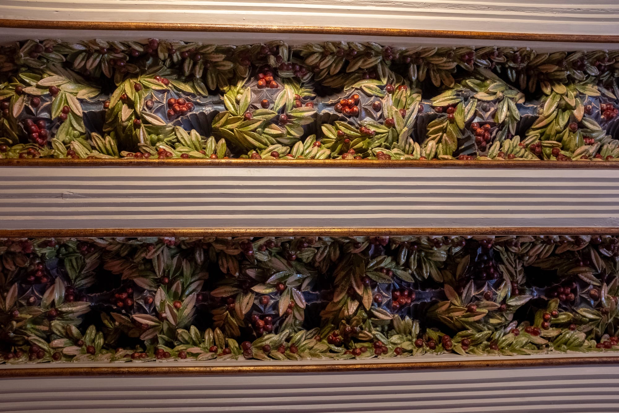 À l’intérieur, les couleurs éclatantes, les motifs variés et les reliefs travaillés captent l’œil à chaque instant. Aucun détail n’est laissé au hasard : des plafonds aux murs, en passant par les cheminées ou les boiseries, tout semble pensé pour surprendre et émerveiller le visiteur.