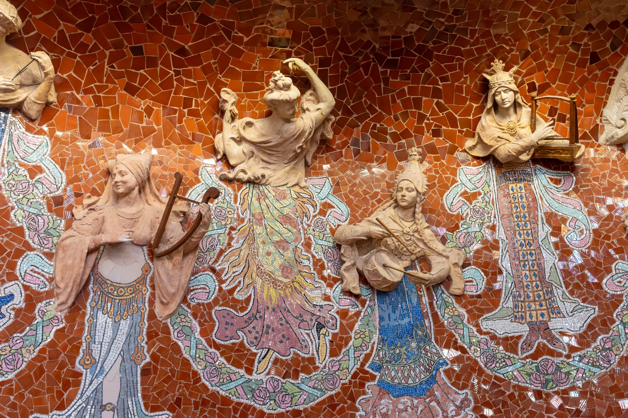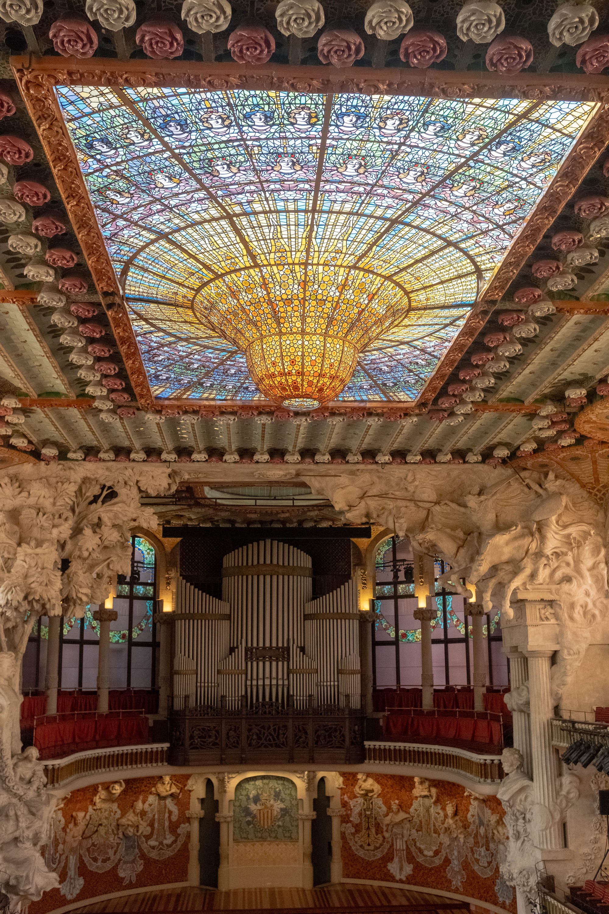 La salle du Palais de la Musique Catalane est tout simplement spectaculaire. Baignée de lumière grâce à ses immenses vitraux colorés, ornée de mosaïques, de sculptures et de détails sculptés dans chaque recoin, elle dégage à la fois élégance et grandeur. L’acoustique parfaite et l’harmonie des couleurs font de cet espace un lieu à la fois visuel et sonore, où chaque visite devient une expérience immersive.
