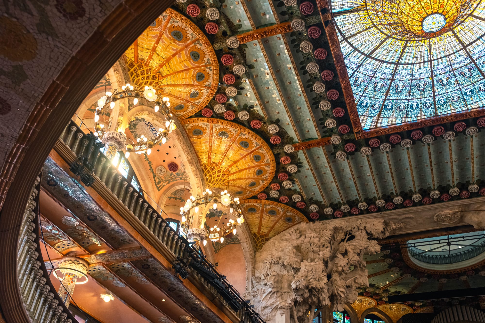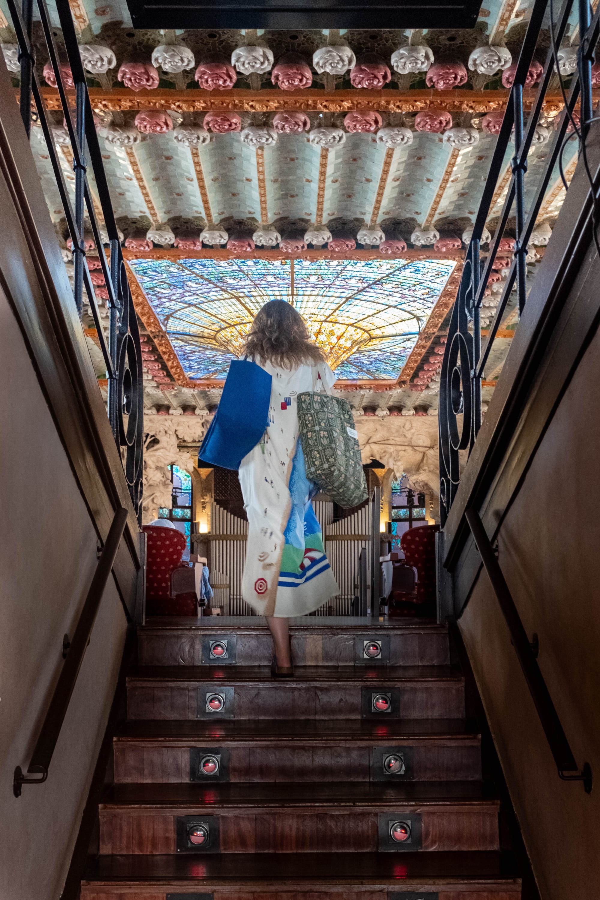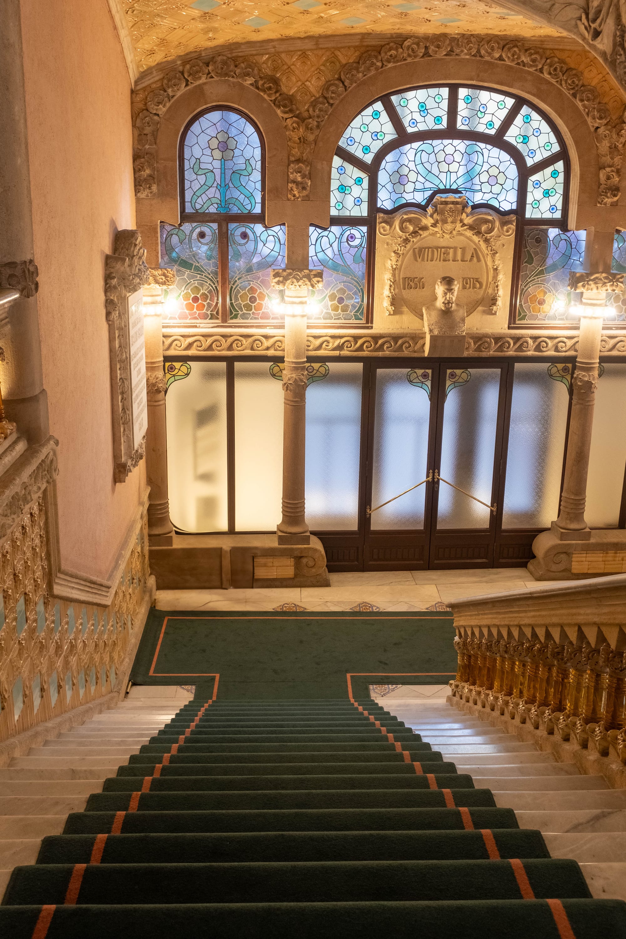 Les escaliers sont autant de chefs-d’œuvre que la salle elle-même. Courbes élégantes, rampes finement travaillées et détails sculptés accompagnent le visiteur dans sa montée, créant un parcours à la fois fluide et théâtral. Chaque palier offre des perspectives différentes sur l’architecture, invitant à lever les yeux et à admirer le travail minutieux des artisans du modernisme catalan.