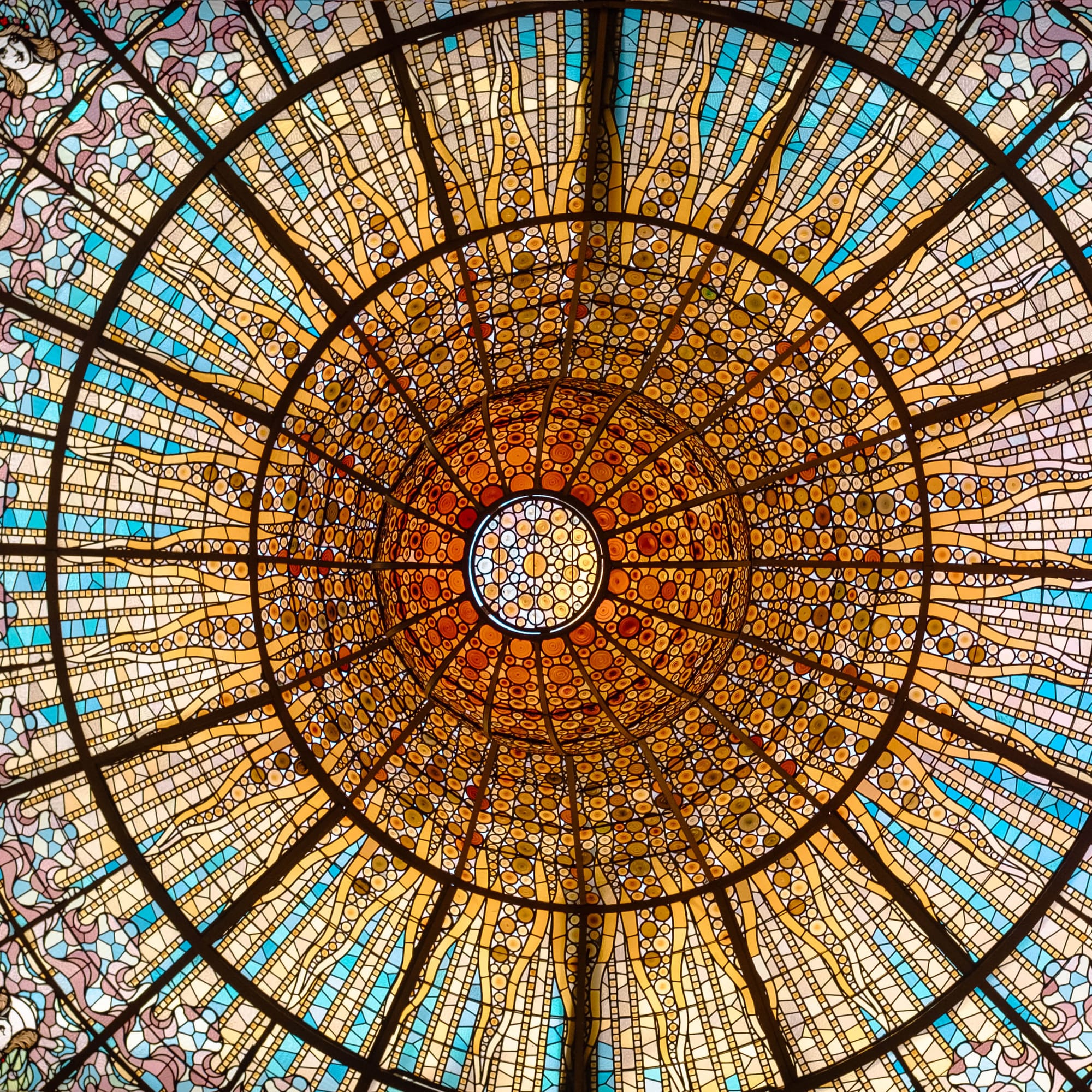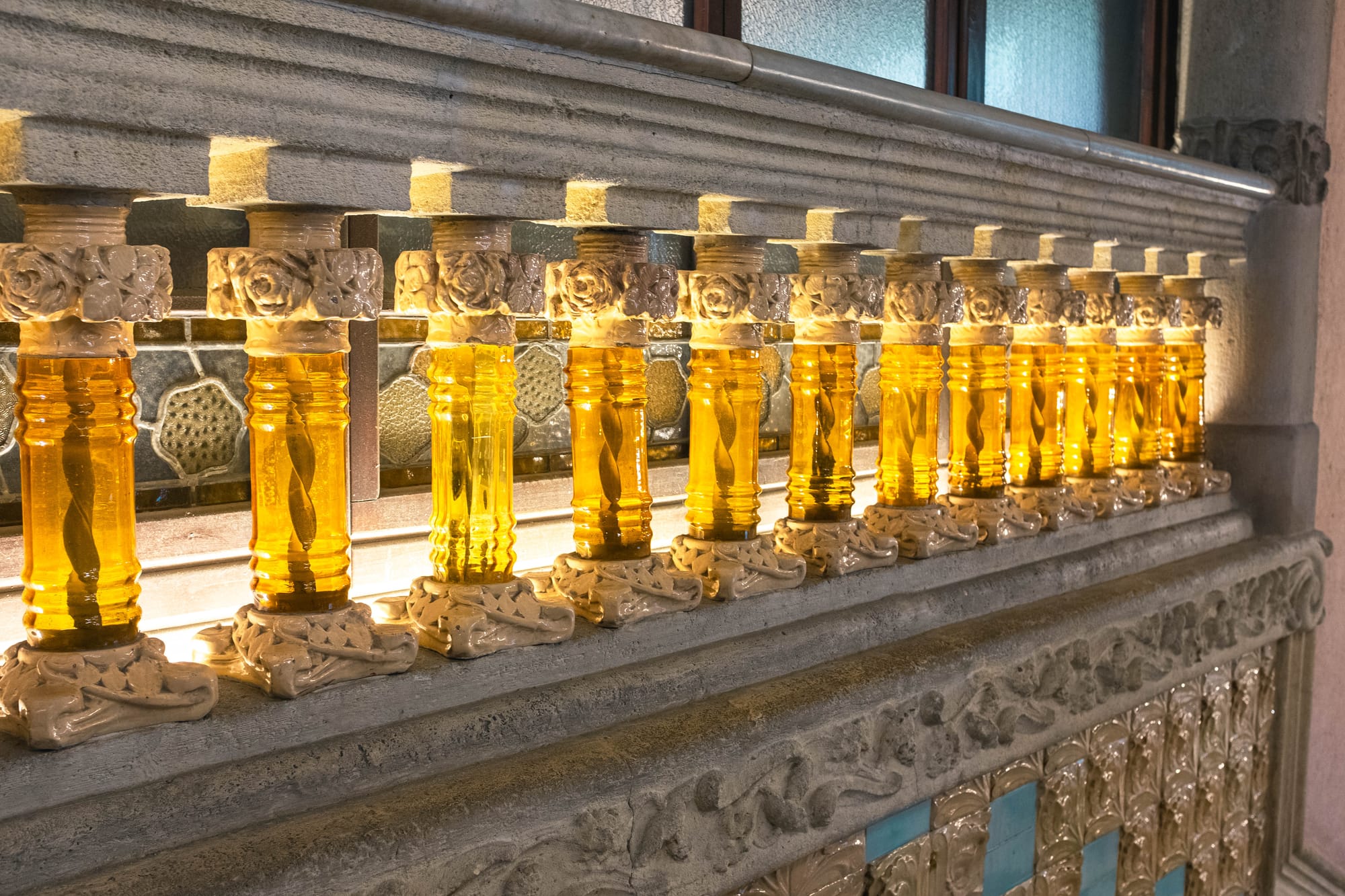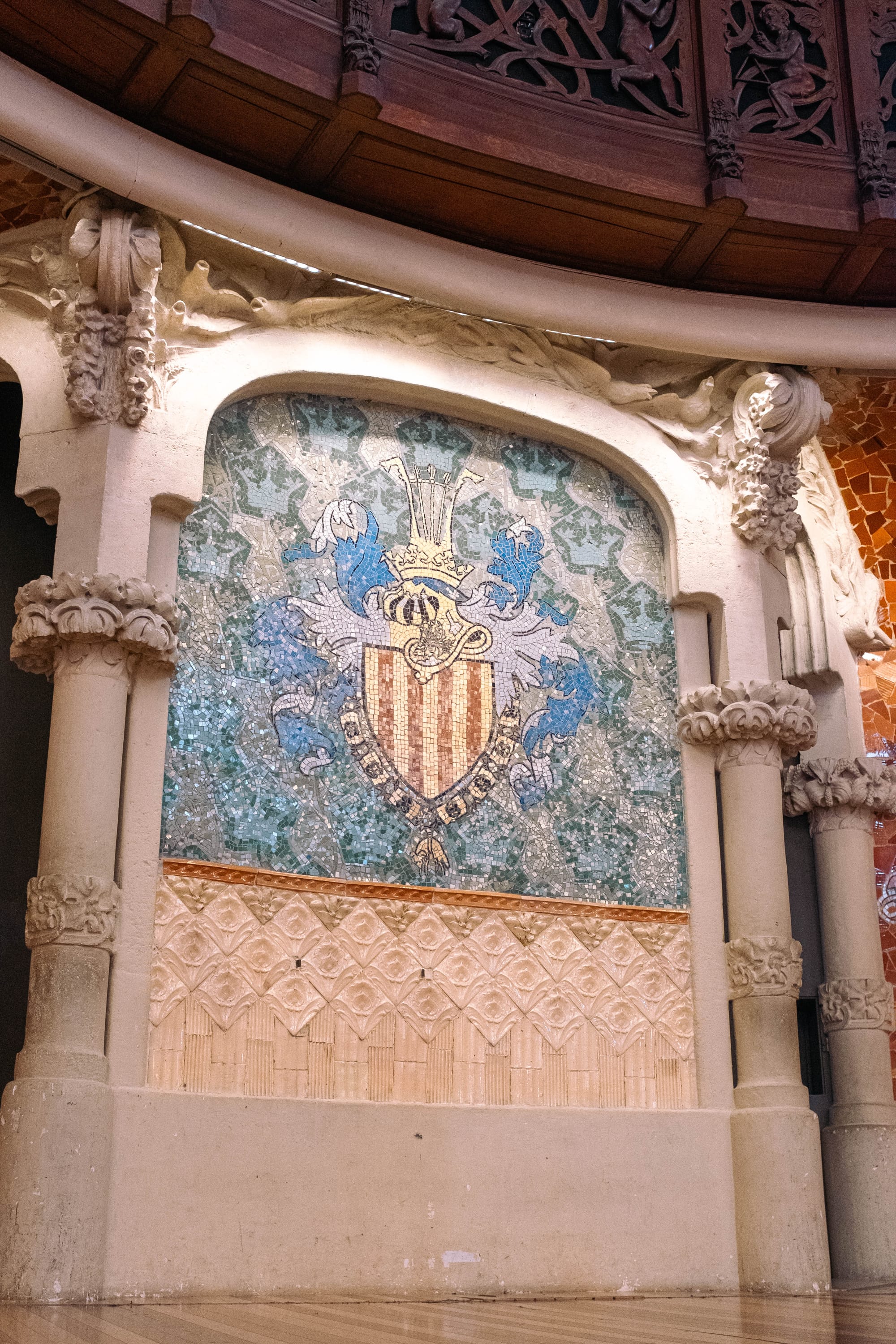 Les escaliers sont autant de chefs-d’œuvre que la salle elle-même. Courbes élégantes, rampes finement travaillées et détails sculptés accompagnent le visiteur dans sa montée, créant un parcours à la fois fluide et théâtral. Chaque palier offre des perspectives différentes sur l’architecture, invitant à lever les yeux et à admirer le travail minutieux des artisans du modernisme catalan.